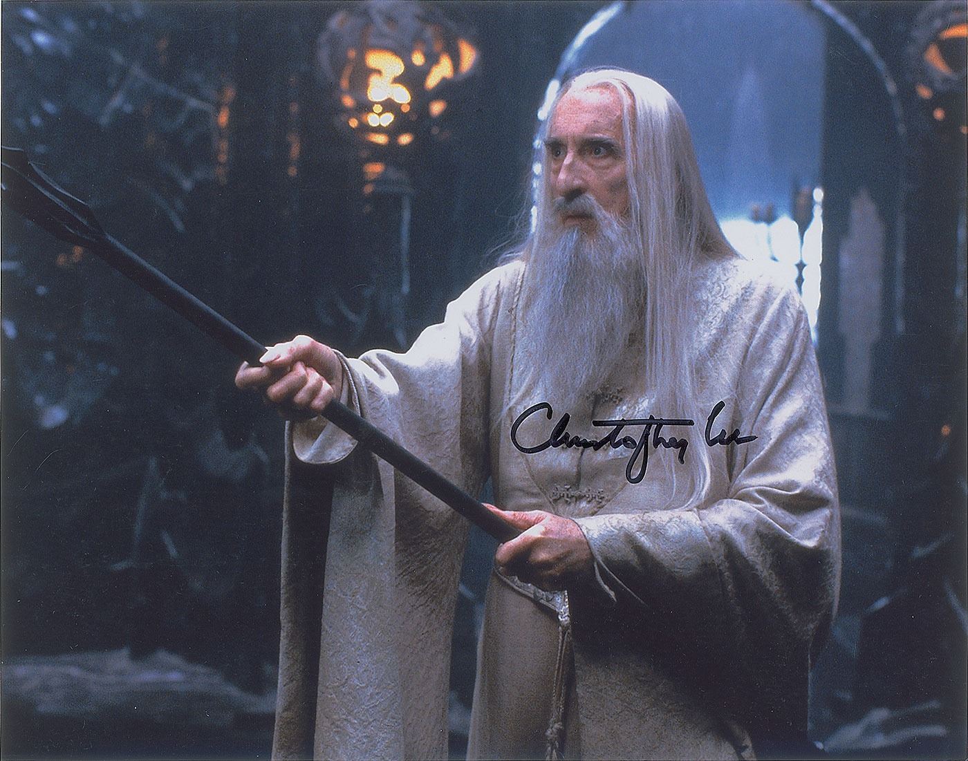 Color glossy 10 x 7.75 half-length photo of Lee as Saruman from the 2001 film The Lord of the Rings: The Fellowship of the Ring, signed in black felt tip. Collector's stamp on reverse indicates that the signature was obtained at the Radisson Edwardian Hotel in Heathrow on November 14, 2004. In very fine condition.