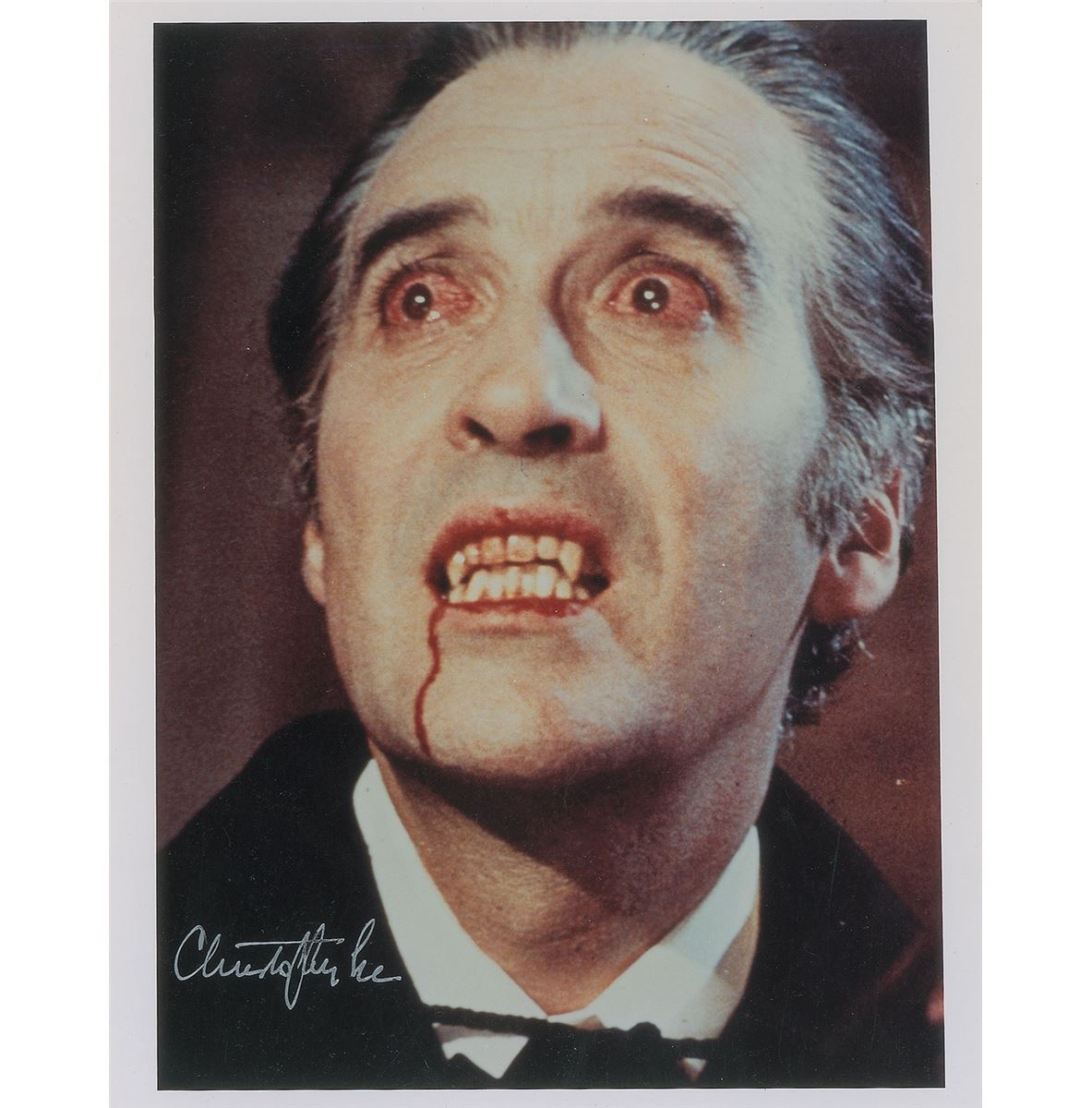 Frightening color glossy 8 x 10 photo of Lee as Dracula, signed in silver ink. In fine condition, with a slightly grainy quality to the image.