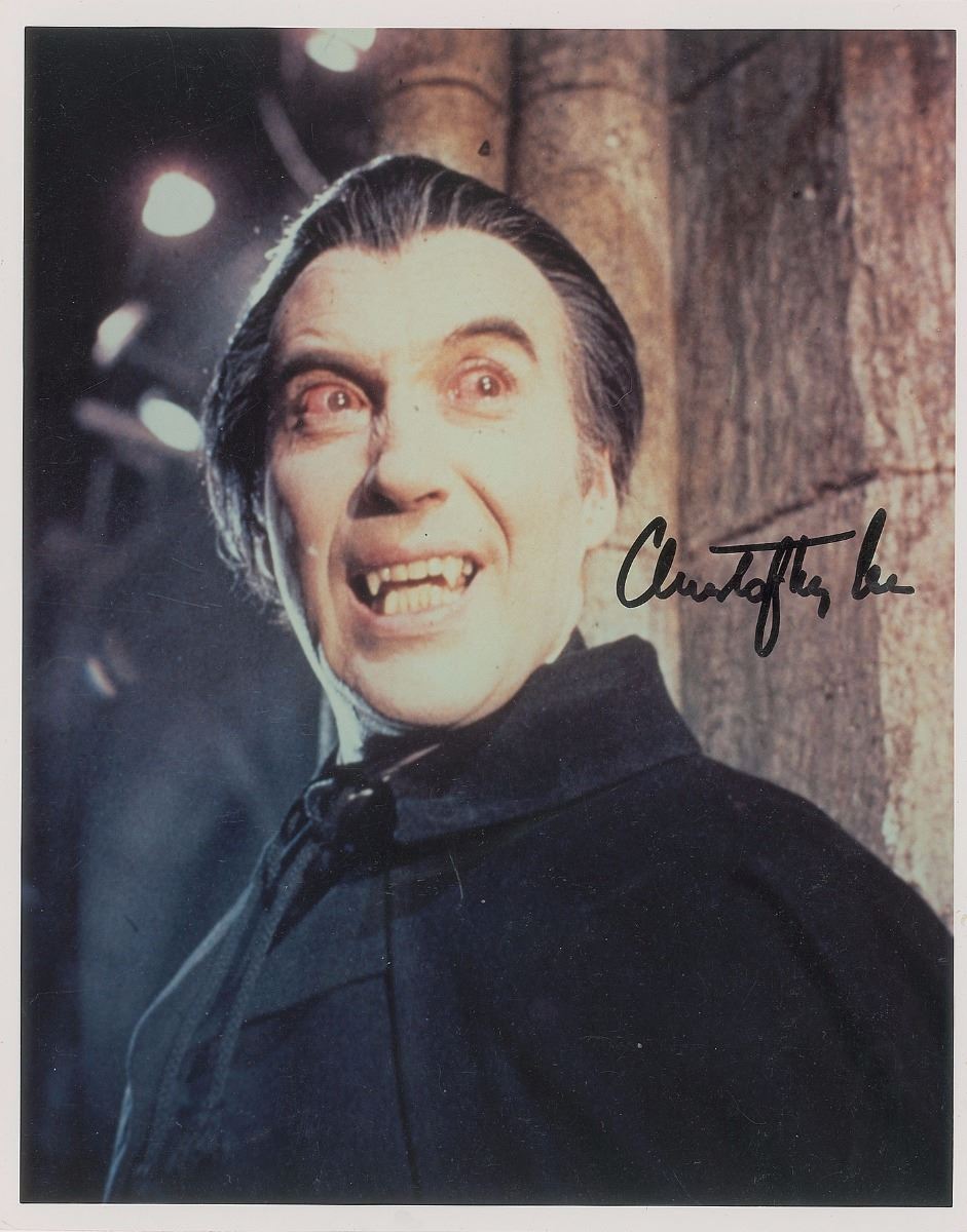 Color glossy 8 x 10 photo of Lee as the fanged Count Dracula, signed in black felt tip. In fine condition, with a slightly grainy quality to the image and a couple small creases to left side.