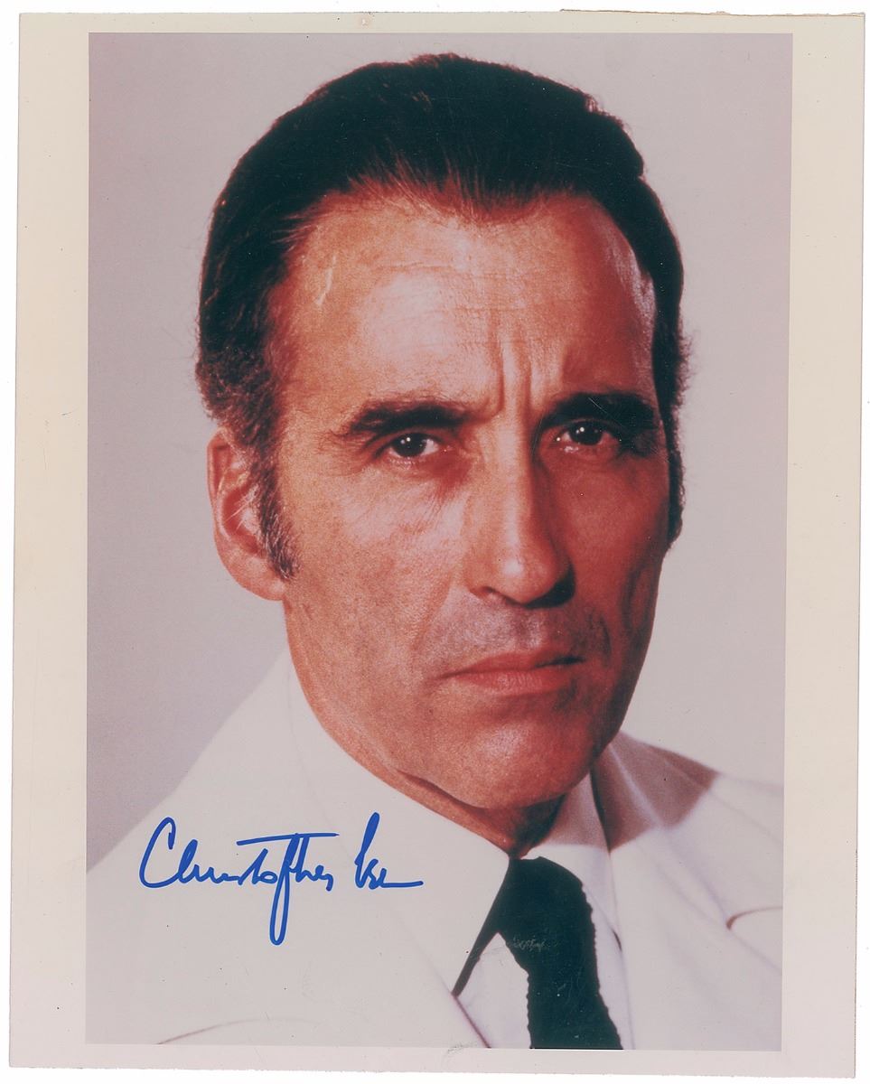 Color glossy 8 x 10 photo of Lee as Francisco Scaramanga from the 1974 Bond film The Man with the Golden Gun, signed in blue felt tip. In fine condition, with trimmed top and bottom edges.