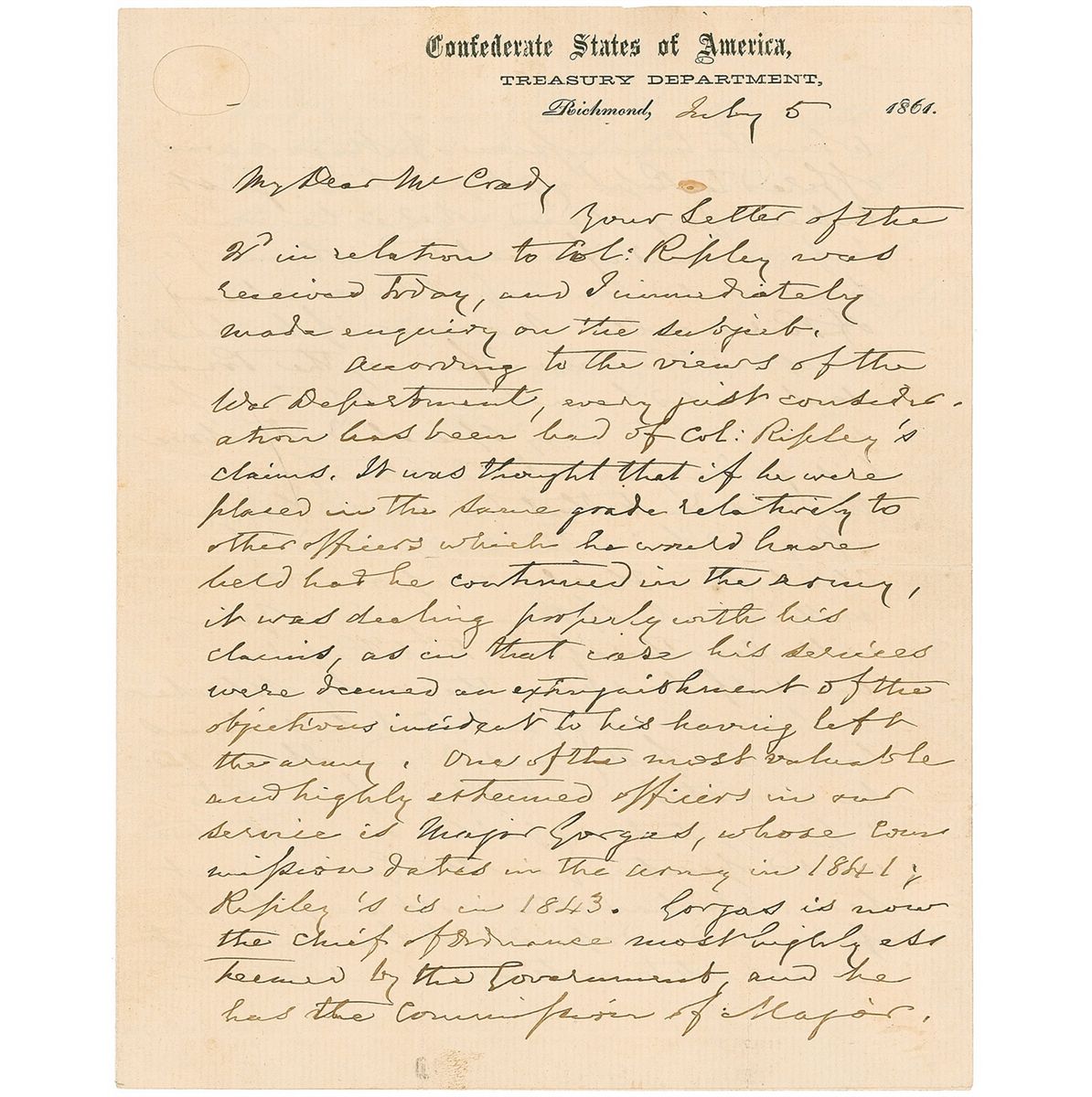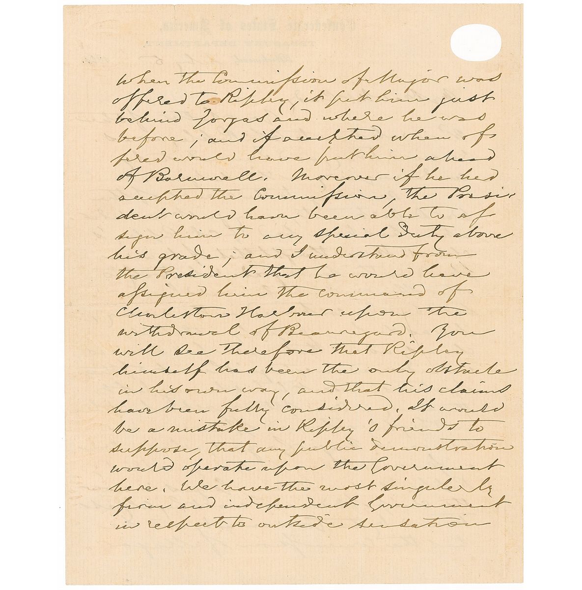 According to the views of the War Department, every just consideration has been made to Col. Ripley’s. It was thought that if he were placed in the same grade relatively to other officers which he would have held had he continued in the army, it was dealing properly with his claims…One of the most valuable and highly regarded officers in the service is Major Gorgas, whose commission dates in the army to 1841; Ripley’s is in 1843. Gorgas is now Chief of Ordnance & highly esteemed by Government and has the commission of Major…When the commission of Major was offered to Ripley, it put him just behind Gorgas, and if accepted…the President would have been able to offer him any special duty above his grade; and I understand from the President that he would have assigned him the command of Charleston Harbor upon the withdrawal of Beauregard…You will see, therefore, that Ripley himself has been the only obstruction to his own way.” In very good condition, with intersecting folds, two through single letters of signature, a uniform shade of toning, and a bit of light soiling.