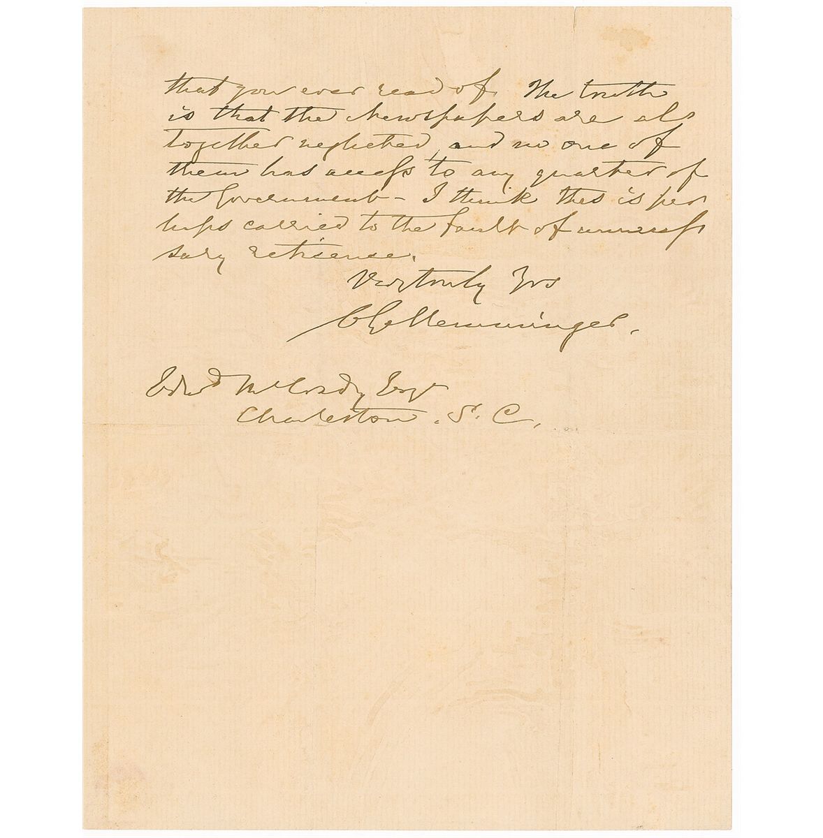 Prominent political leader and the first Secretary of the Treasury for the Confederate States of America. War-dated ALS signed “C. G. Memminger,” three pages on two adjoining sheets, 7.75 x 10, July 5, 1861. Letter to Major Edward McCrady discussing the merits of Confederate Ordnance Chief Josiah Gorgas against the merits of Colonel (later Brigadier General) Roswell Ripley. In part: “Your letter of the 2nd in relation to Col. Ripley was received today and I immediately made inquiry into the subject.