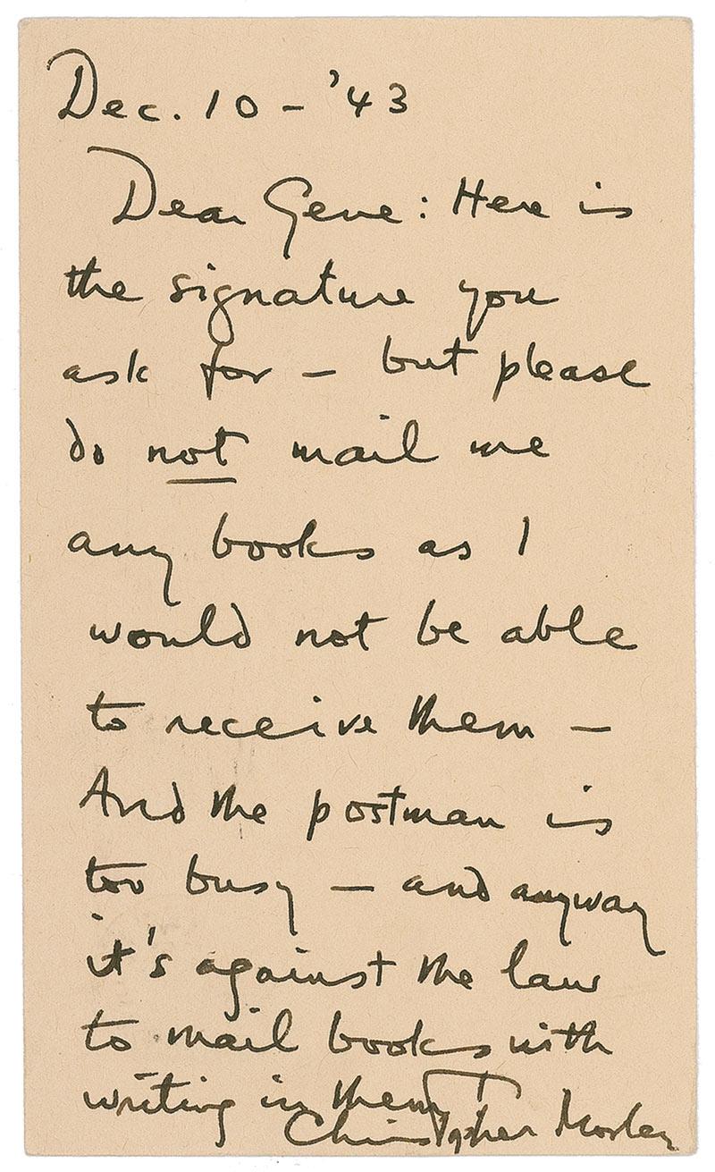 American author (1890–1957). ALS, on a 3.25 x 5.5 government postcard, December 10, 1943. Letter to noted collector Gene Andrewski. In full: “Here is the signature you asked for – but please do not mail me any books as I would not be able to receive them – And the postman is too busy – and anyway it’s against the law to mail books with writing in them.” In fine condition.