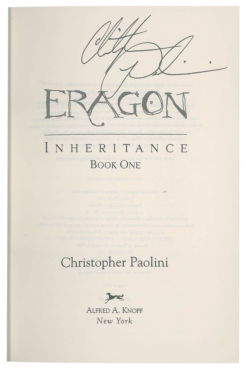 Signed book: Eragon. Later printing. NY: Alfred A. Knopf, 2002. Hardcover with dustjacket, 6.5 x 9.25, 509 pages. Signed on the title page in black felt tip. In fine condition.