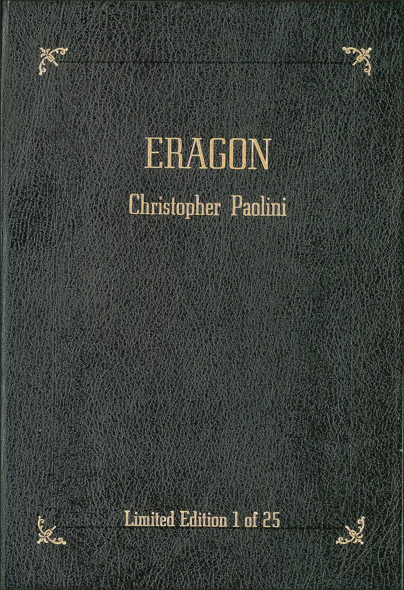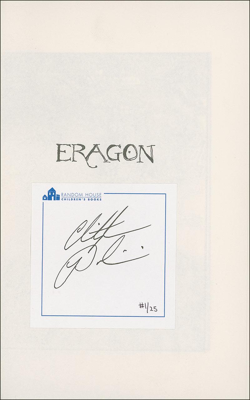 Signed book: Eragon. Later printing. NY: Alfred A. Knopf, 2003. Hardcover with dustjacket, 6.5 x 9.25, 509 pages. Signed on a bookplate affixed to the half-title page, with a limited edition notation of #1/25, written in another hand, which also corresponds with the custom-made clamshell case. In very fine condition.