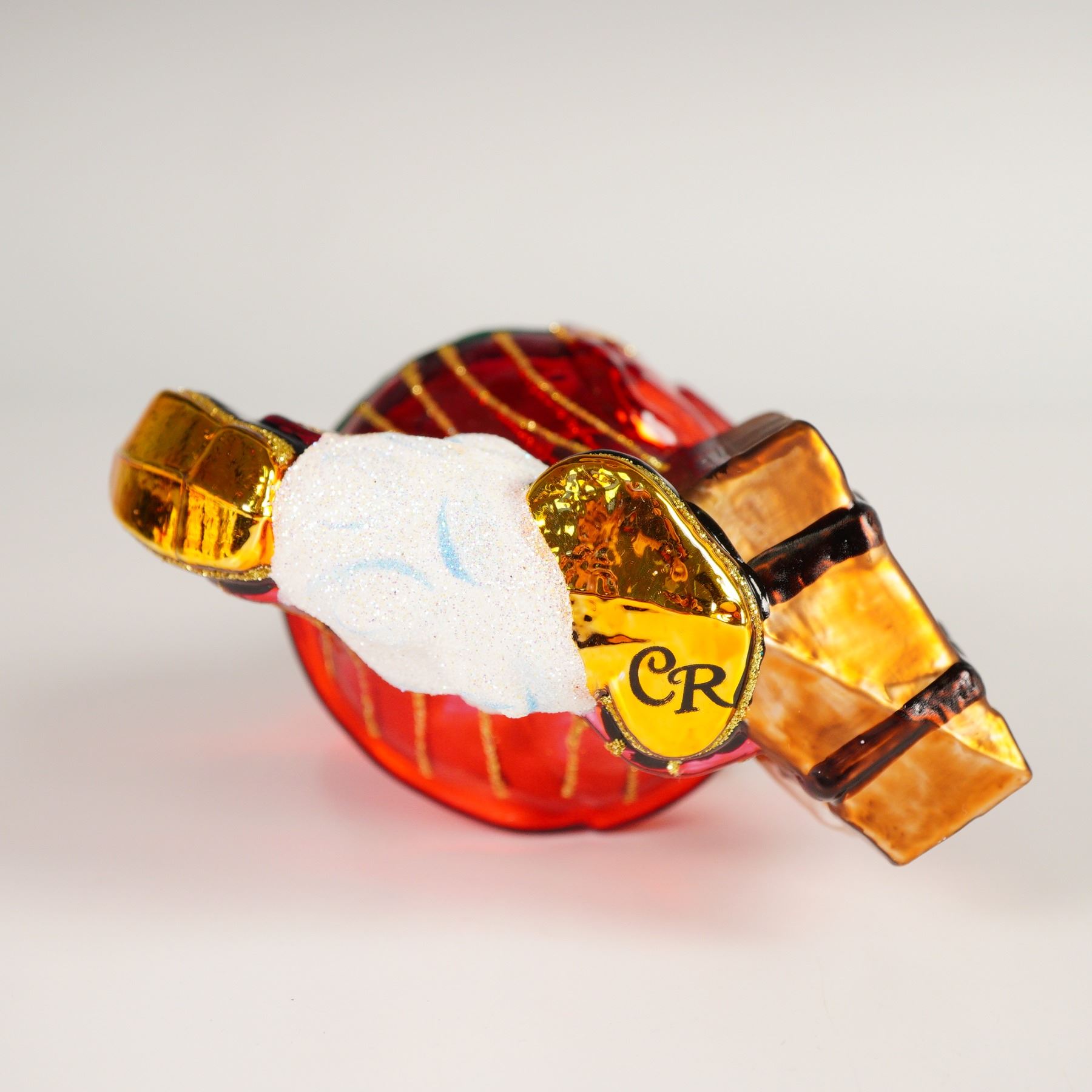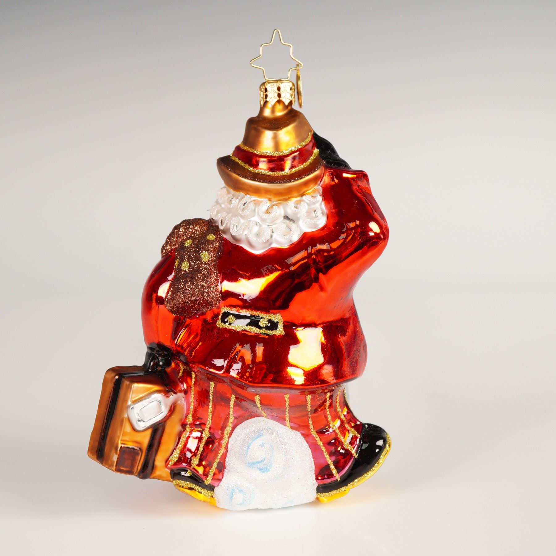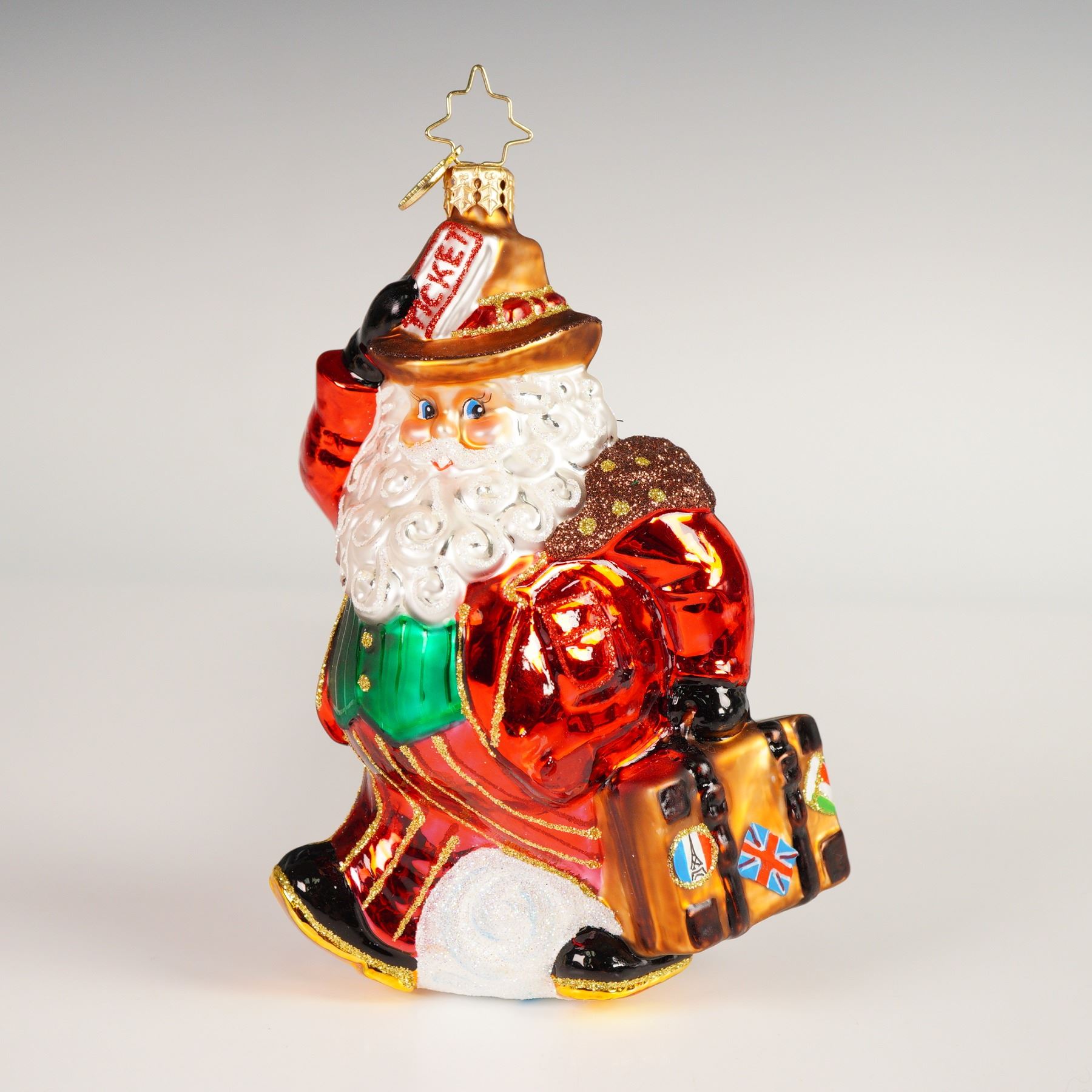 Handcrafted glass ornament depicting Santa Claus with suitcase and ticket detail, decorated in red, green, and gold tones. Features gold-tone cap with star hanger and original Christopher Radko hang tag. Marked CR on the base.