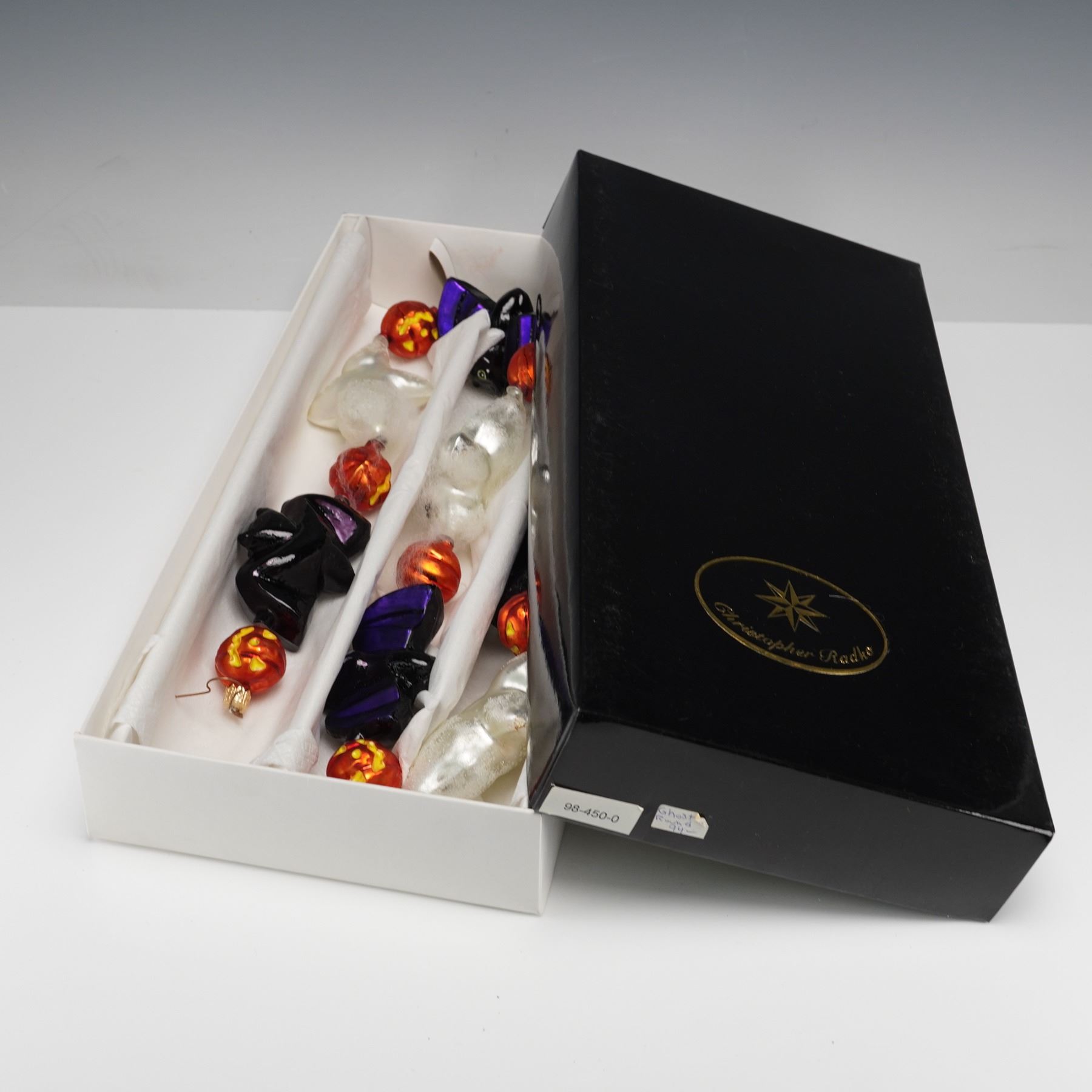 Christopher Radko Halloween glass garland featuring hand-blown and hand-painted ornaments in the form of purple and black bats, silver ghosts, and orange pumpkins, each with vivid detailing and metallic accents. The garland is presented in its original black Christopher Radko box with gold logo.