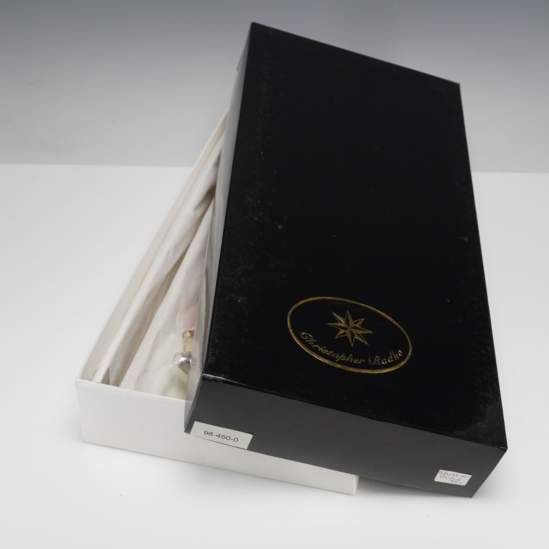 Christopher Radko Halloween garland featuring handblown glass ornaments in the shapes of ghosts, bats, and pumpkins. Each ornament is finished in vibrant shades of silver, black, purple, and orange with metallic accents, strung together on a white cord. Includes the original black Christopher Radko presentation box with gold logo.