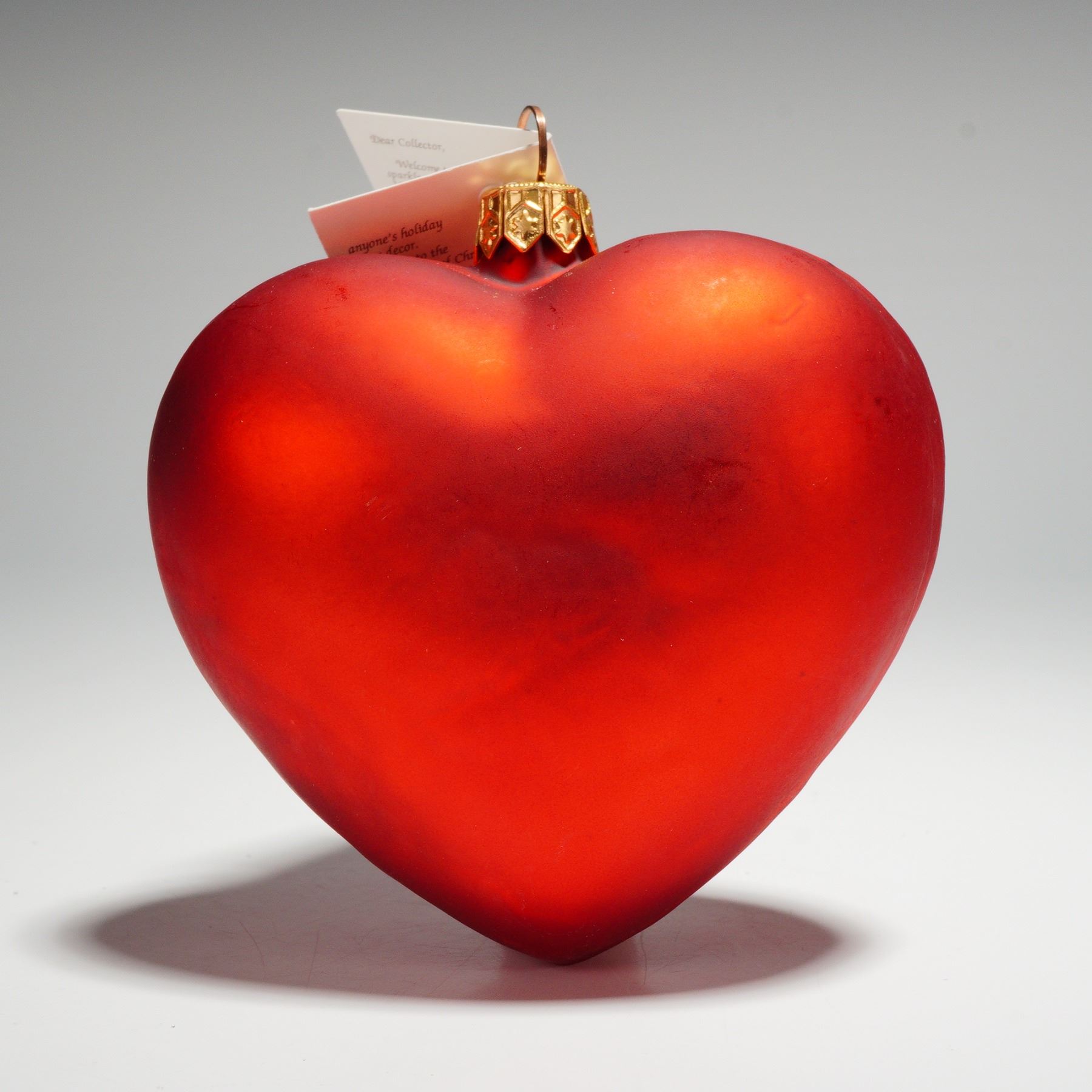 This 1997 Christopher Radko glass ornament is crafted in the shape of a bold red heart and features the classic I Love Lucy logo in black script across the front, finished with a gold-tone cap and original hang tag.