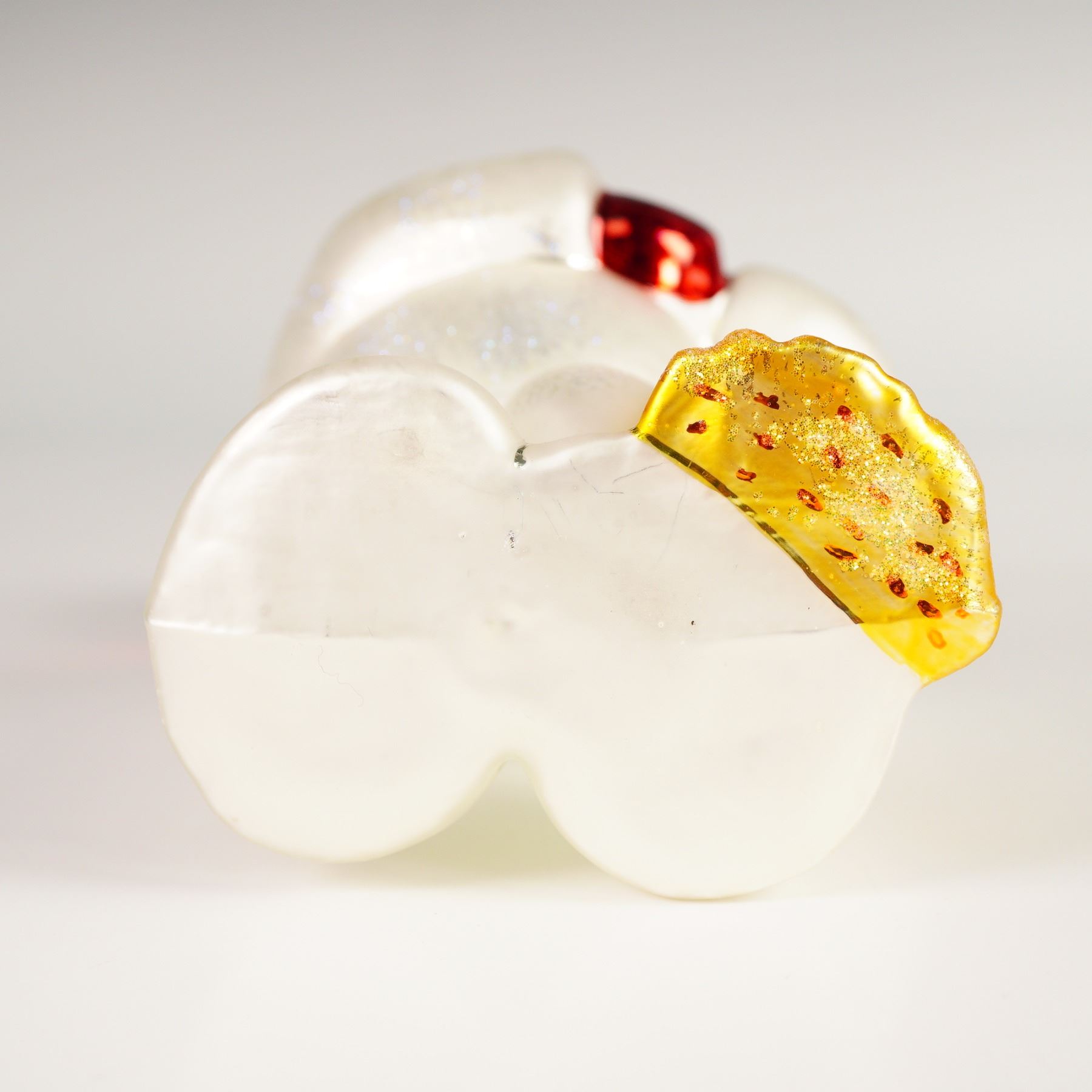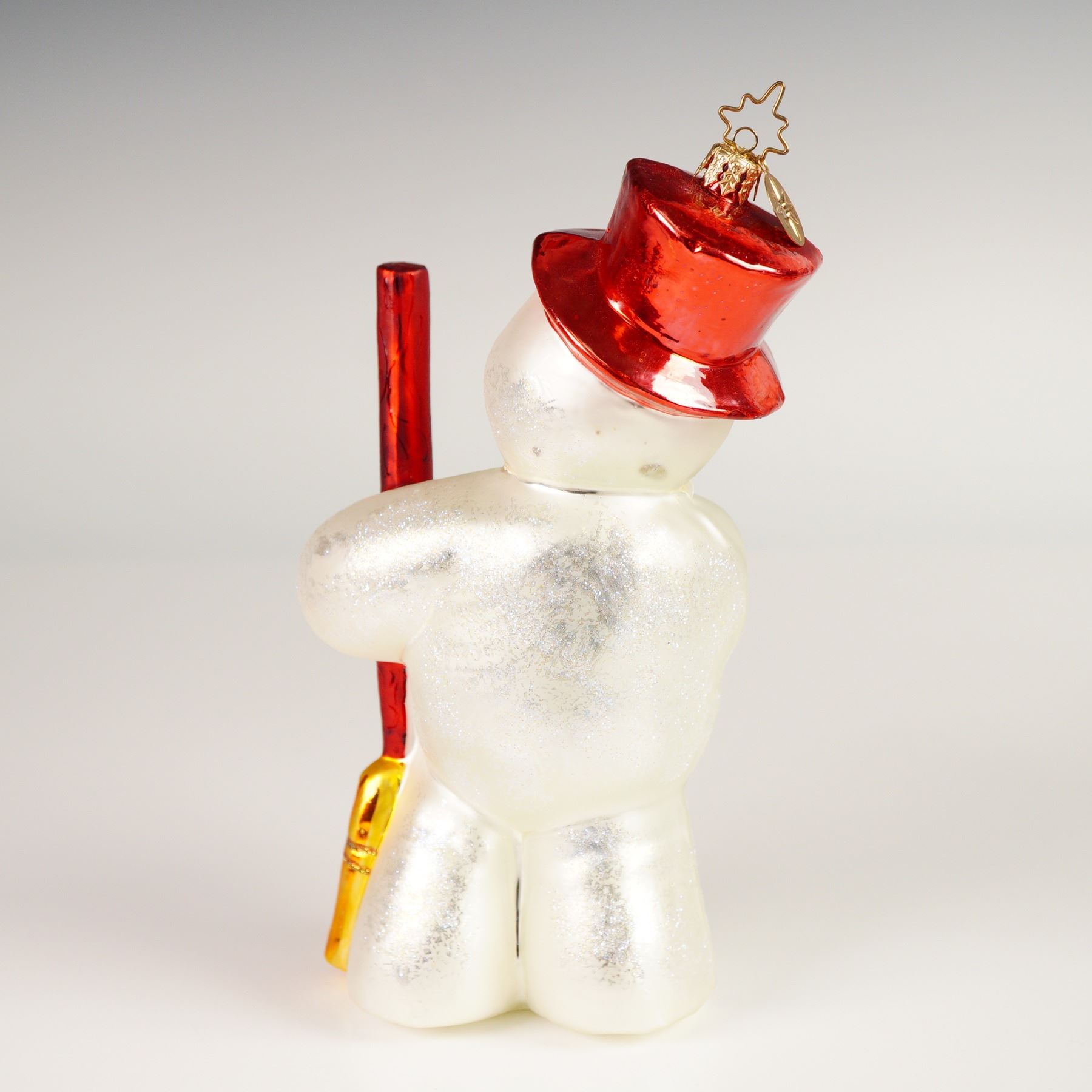 Handblown glass ornament depicting a snowman holding a broom, finished in red, white, and gold with glittered accents. Features a gold-tone cap with star hanger typical of Christopher Radko design.