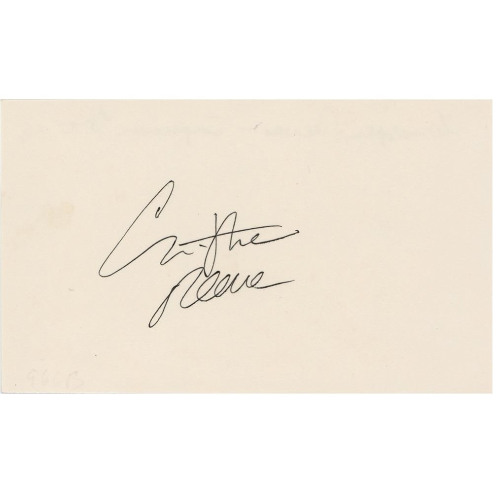 Bold ballpoint signature of Superman, "Christopher Reeve," on a white 5 x 3 card. In very fine condition.