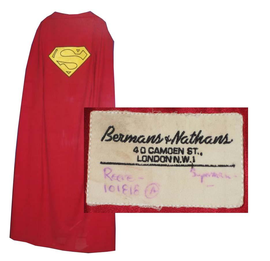 Original Superman cape worn by Christopher Reeve during filming of ''Superman: The Movie'' and ''Superman II,'' as both movies were filmed simultaneously. Reeve wore several capes during filming including ''walking capes'' and ''flying capes.'' This is one of the ''walking capes,'' without the holes used for flight wiring. Bright red cape is made complete with Superman's large emblematic gold and black stenciled ''S'' sewn onto the back. The original ''Bermans & Nathans / 40 Camden Street / London N.W. 1'' tag is still intact on the cape's inner collar, with the number of the cape handwritten on the tag in faded purple ink: ''Reeve - 101818-A / Superman''. Cape measures 24'' x 58'' and is in near fine condition. Includes a notarized letter of provenance from the daughter of the film's executive producer, Ilva Salkind.