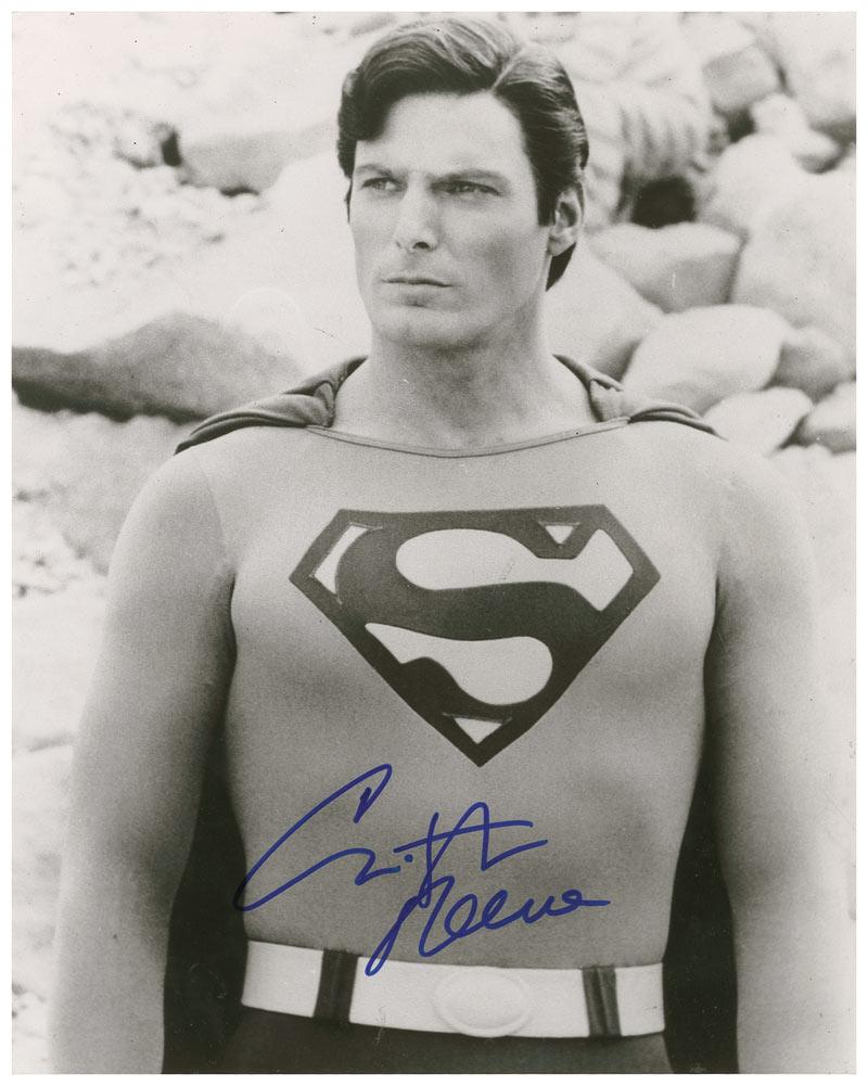 Desirable glossy 8 x 10 photo of Reeve as Superman, signed in blue felt tip. In fine condition.