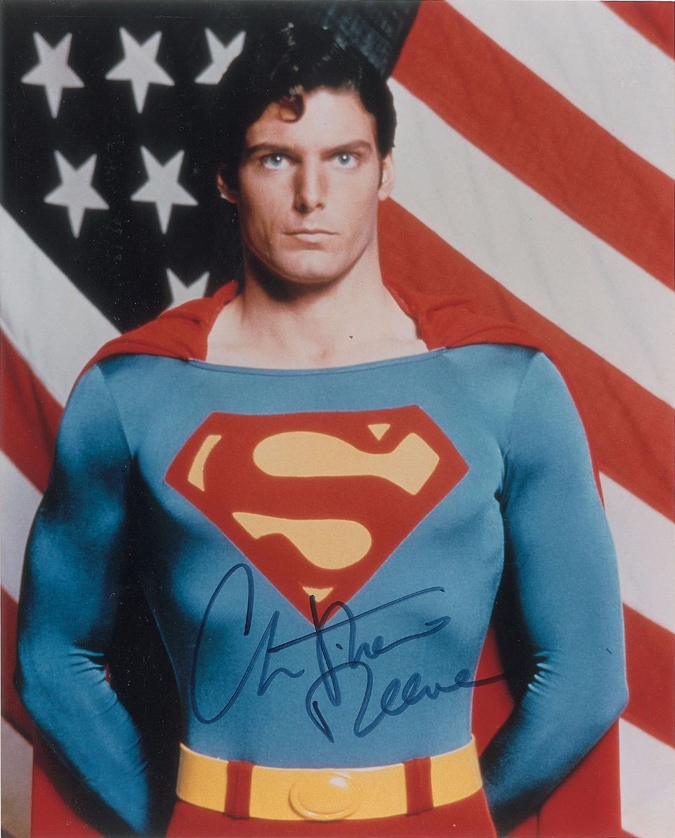 Emblematic color glossy 8 x 9.75 photo of Reeve as his most recognizable character, Superman, signed in black ink. In fine condition.