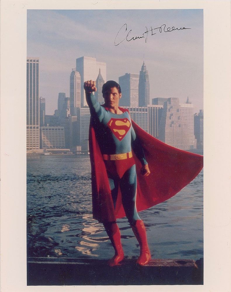 Wonderful color glossy 8 x 10 full-length photo Reeve as Superman, standing heroically in front of a river and city landscape, signed in black ink. In fine condition.