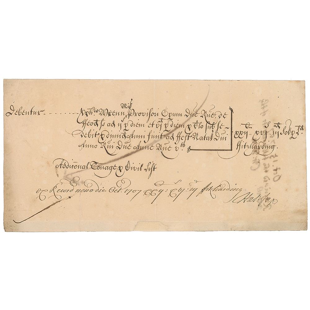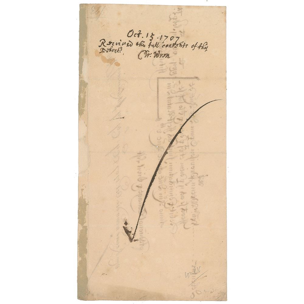 Rare autograph endorsement, "Chr. Wren," on the reverse of a manuscript receipt in Latin, 9.5 x 4.75, October 15, 1707, relating to a payment made to Wren during the reign of Queen Anne, signed below by Charles Montagu, 1st Earl of Halifax. Endorsed on the reverse in bold black ink, "Oct. 15. 1707, Received the full contents of this Indent'e, Chr. Wren," who adds a large swoosh in the space below. In very good to fine condition, with a small area of repaired paper loss to the bottom edge, and old mounting remnants along one edge of the reverse.