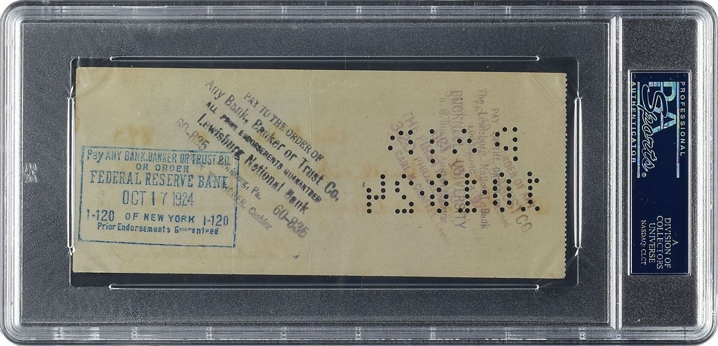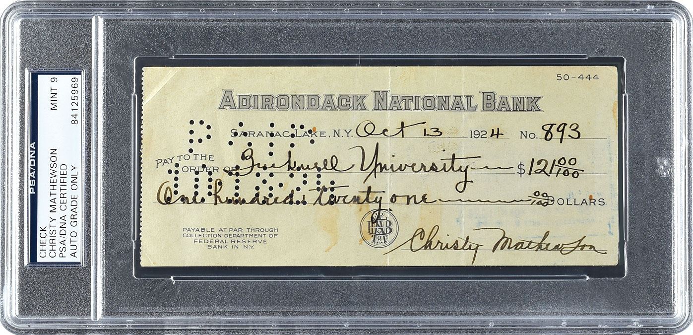Adirondack National Bank check, 6.5 x 2.75, filled out and signed by Mathewson, "Christy Mathewson," payable to Bucknell University for $121, October 13, 1924. In fine condition, with two light vertical folds and minor staining. Mathewson made a name for himself while attending Bucknell from 1898 to 1902, where he starred on the football team as a fullback and punter—he made the 1900 All-America football team as Walter Camp proclaimed him to be 'the greatest drop-kicker in intercollegiate competition.' He also pitched for the baseball team and played center on the basketball team, though he earned less renown in these areas. Even after his enormously successful professional baseball career, Mathewson maintained strong ties to his alma mater, as evidenced by this check. By this time in his life, Mathewson had contracted tuberculosis and moved to the frigid climate of Sarnac Lake, New York, where he sought respite at the Adirondack Cottage Sanitarium. He passed away a year later, and was laid to rest at Lewisburg Cemetery in Lewisburg, Pennsylvania, adjacent to his beloved Bucknell University. Elevating price history demands some mention here as a different PSA 9 example sold in 2018 for nearly $21,000 confirming the hobby's escalating demand for autograph grading, especially in the area of its most highly valued collectibles. Encapsulated by PSA/DNA, with the bold signature graded "MINT 9."