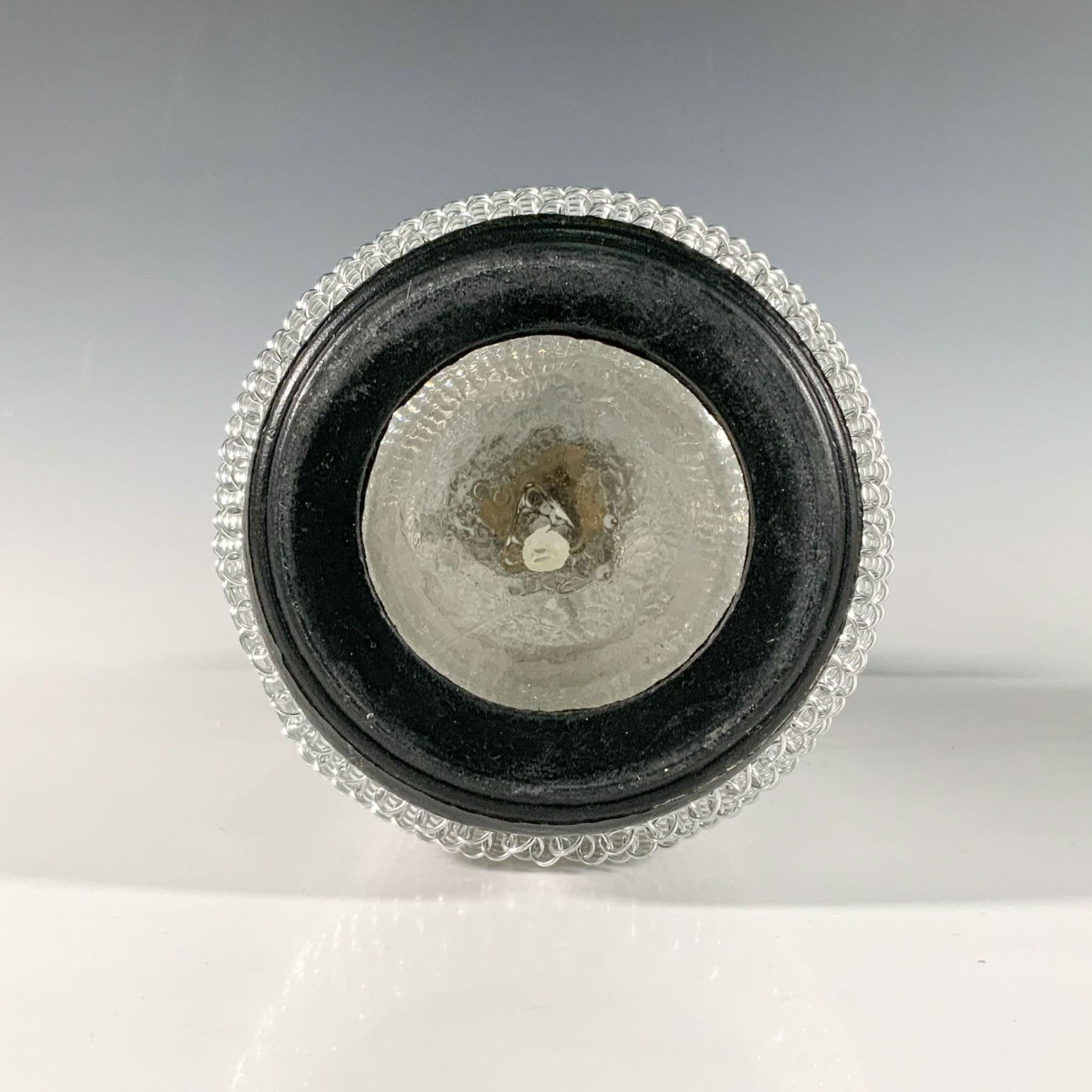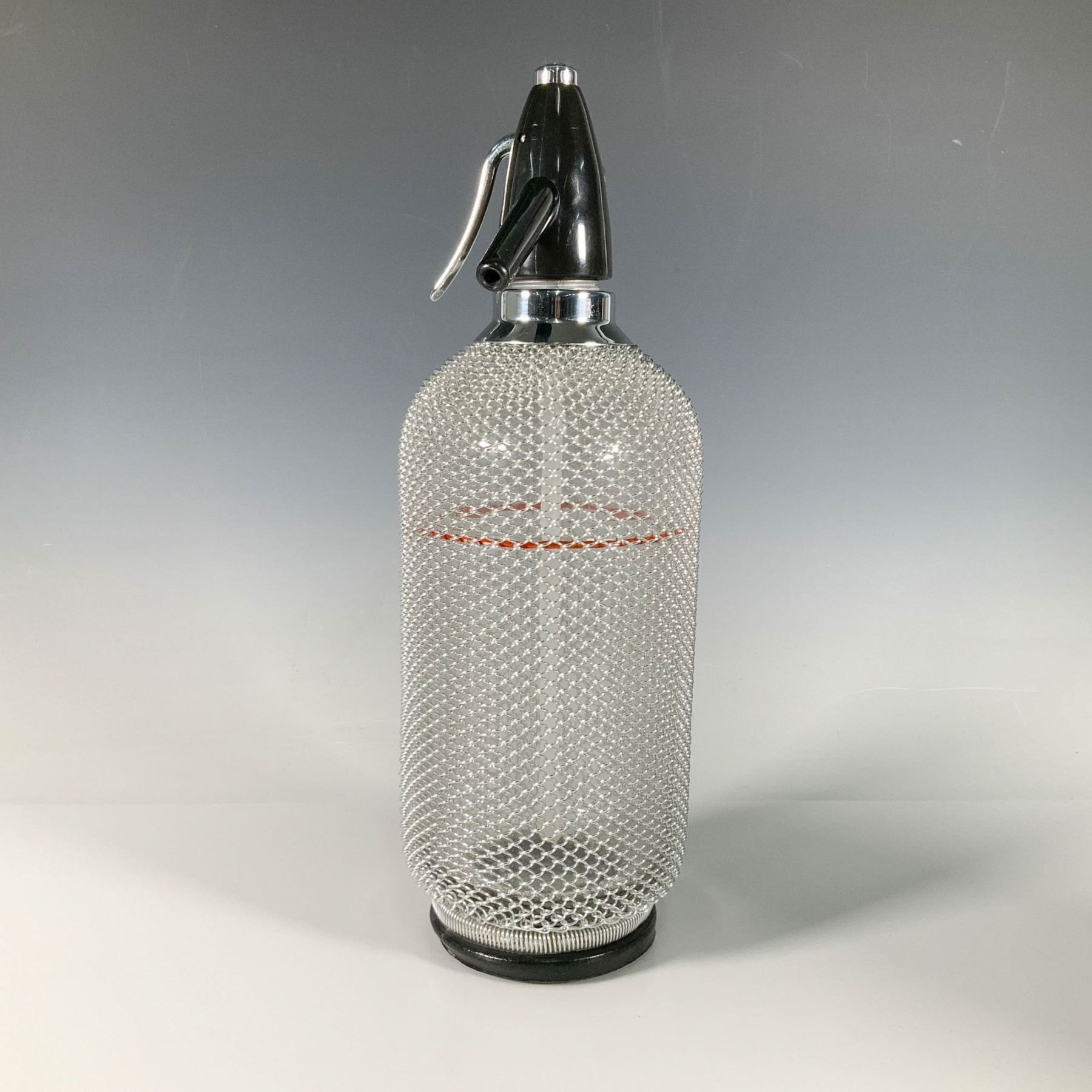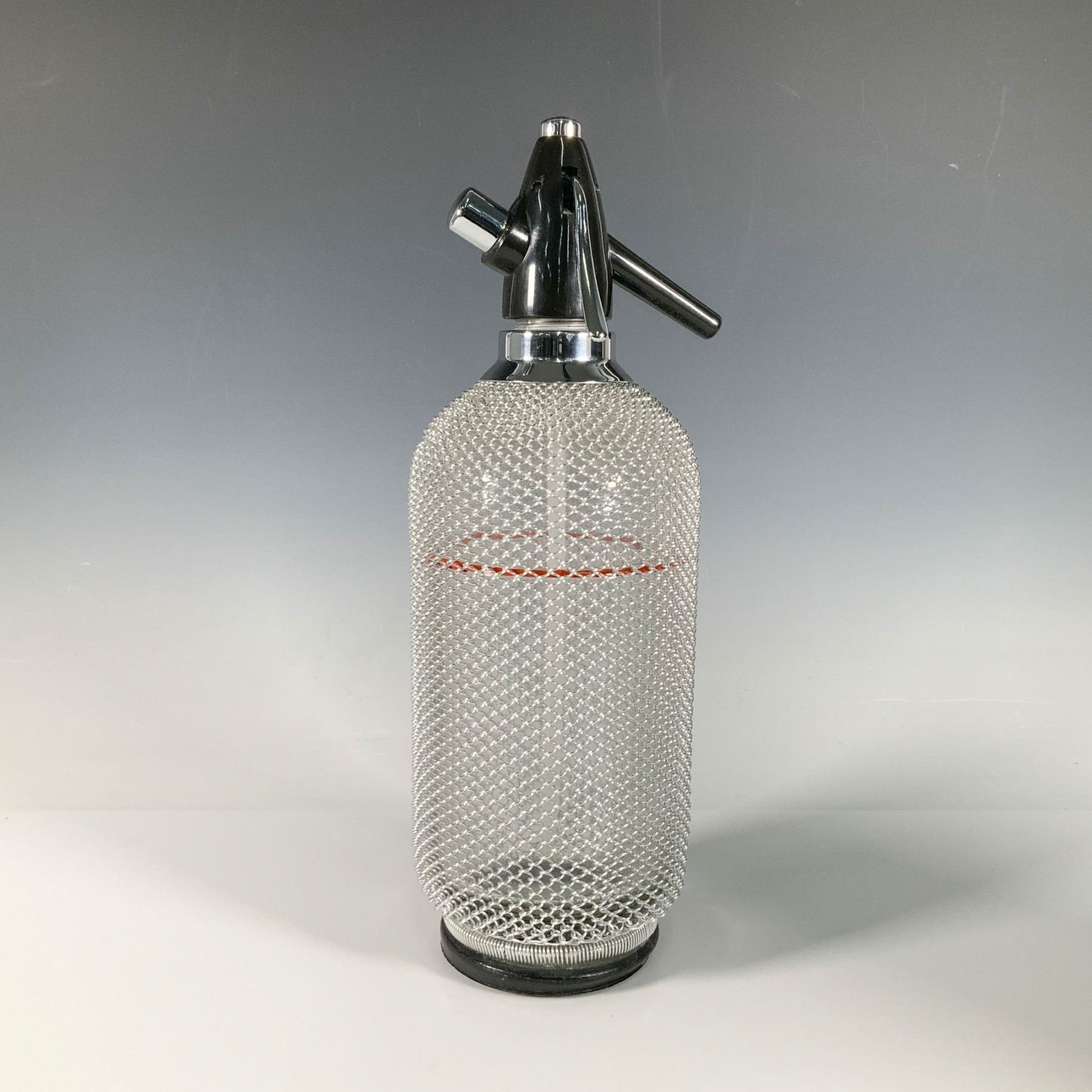 A retro-style kitchen decor piece designed to carbonate water, featuring a glass body encased in chrome mesh. It includes a bakelite and chrome cap with a siphon mechanism, allowing the user to press a lever to release carbonated water.