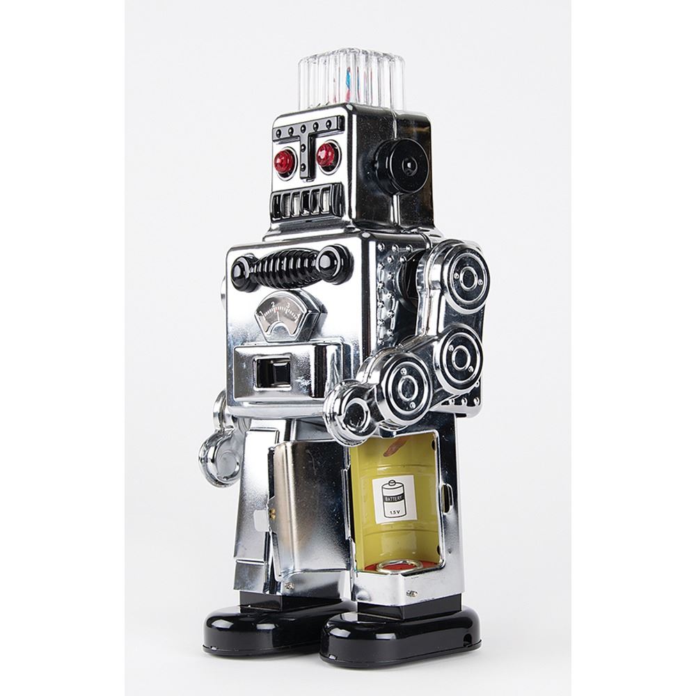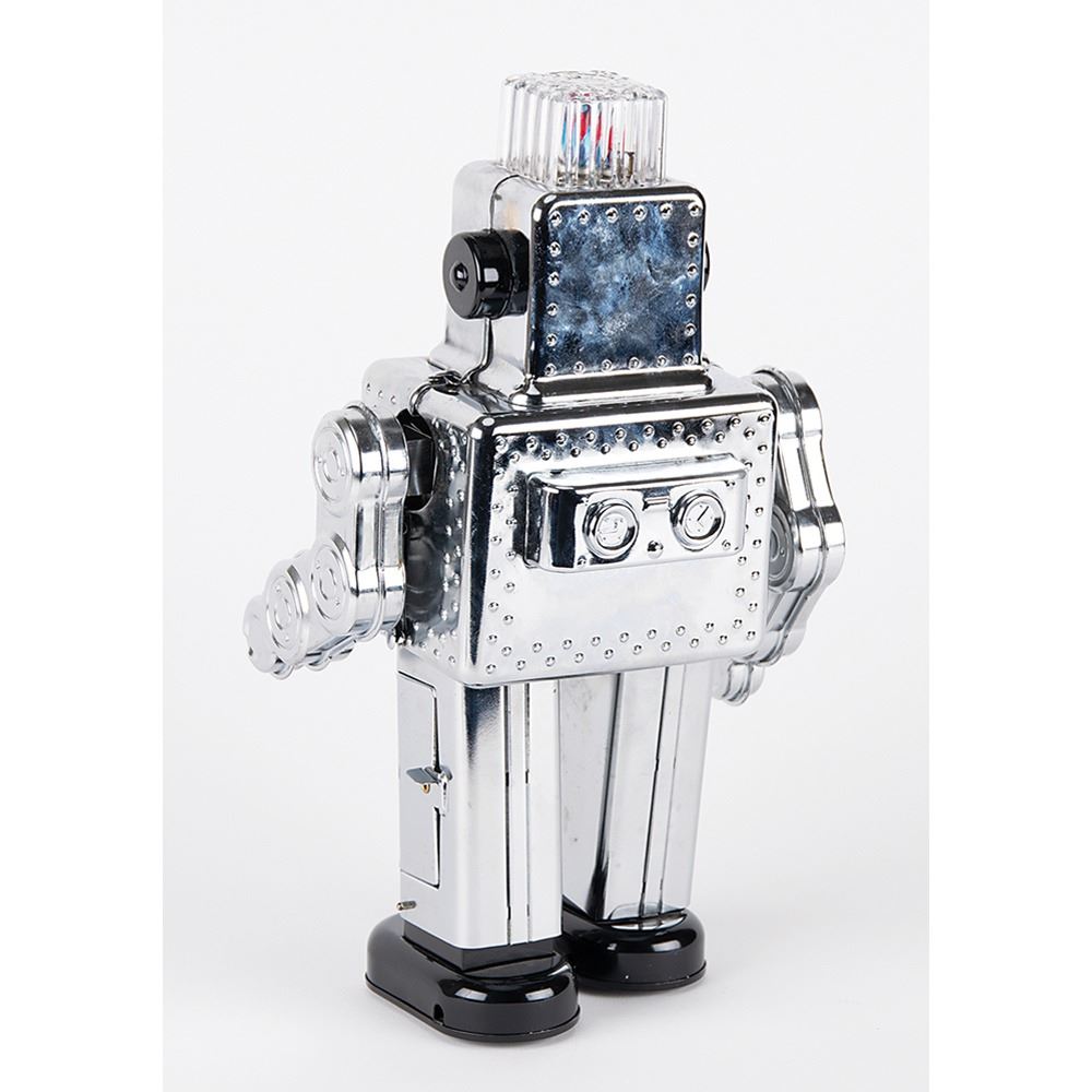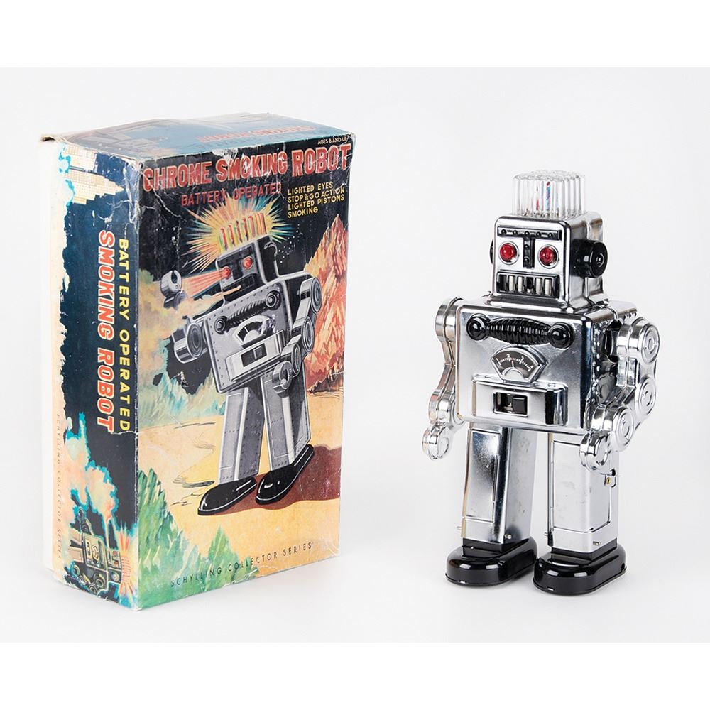 Exceptional circa 2000 battery-operated "Chrome Smoking Robot" walking tin toy robot, made by Schylling as part of its collector's series, standing 12Àù tall. Inspired by the iconic toys of the 1950s and 60s, this shiny chrome retro robot features lighted eyes, stop-and-go action, lighted pistons, swaying arms, and smoking action. Includes the original box, which is rather scuffed and worn.