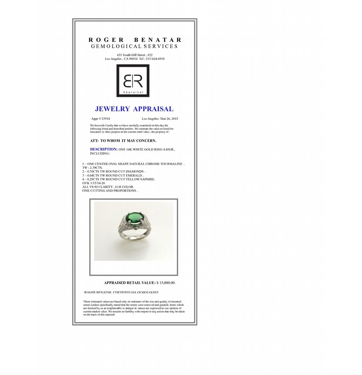 14k White Gold, Chrome Tourmaline Avg 2.00ct Oval Deep Green color, .70ctw Round Diamond G-H color VS-SI clarity, .04ct Round Emerald, .29ctw Round Yellow Sapphire
