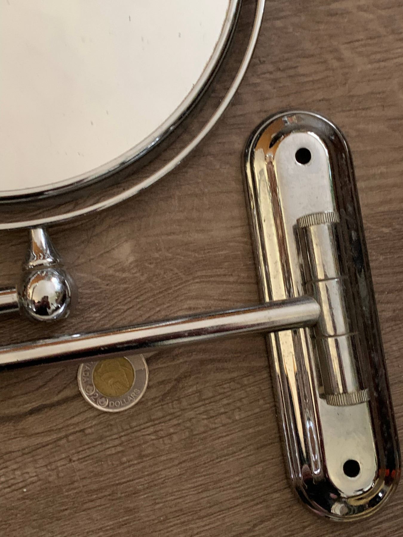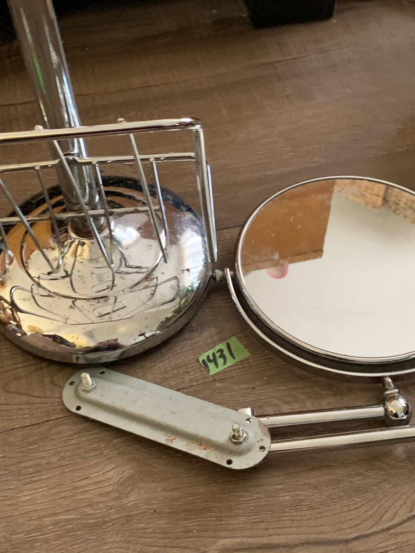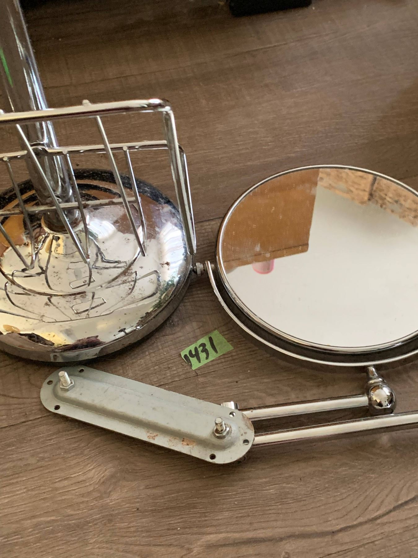 Chrome bathroom accessories - toilet paper, magazine rack and magnification mirror - mounting bracket for wall