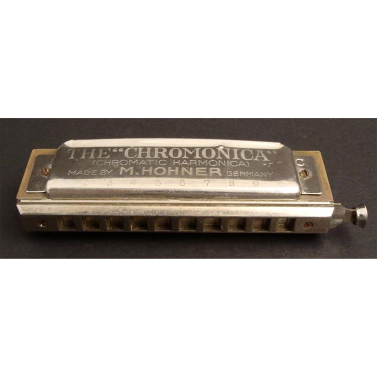 This vintage Chromonica is a chromatic harmonica made by M Hohner of Germany. It features 10 holes and 40 reeds, and plays at 2 1/2 full chromatic octaves. It is in very good and clean sounding condition. The back and sides have a plastic wood grain, with some light wear. The octave button operates smoothly. * The Chromonica is a famous harmonica that is still being made today, and this is a fine vintage model.
