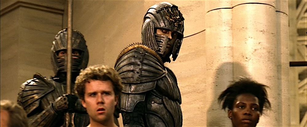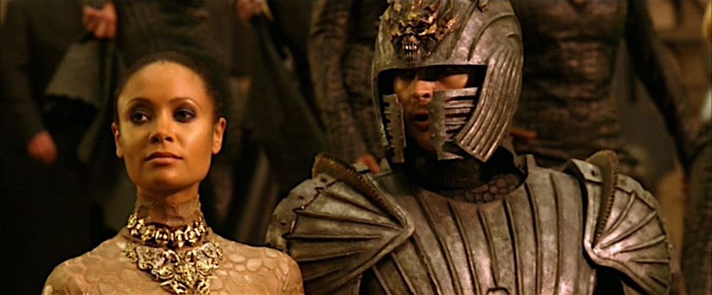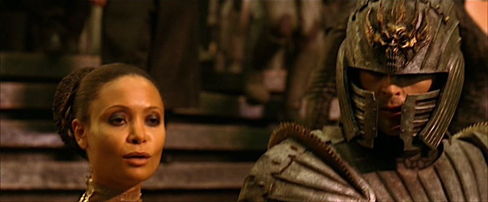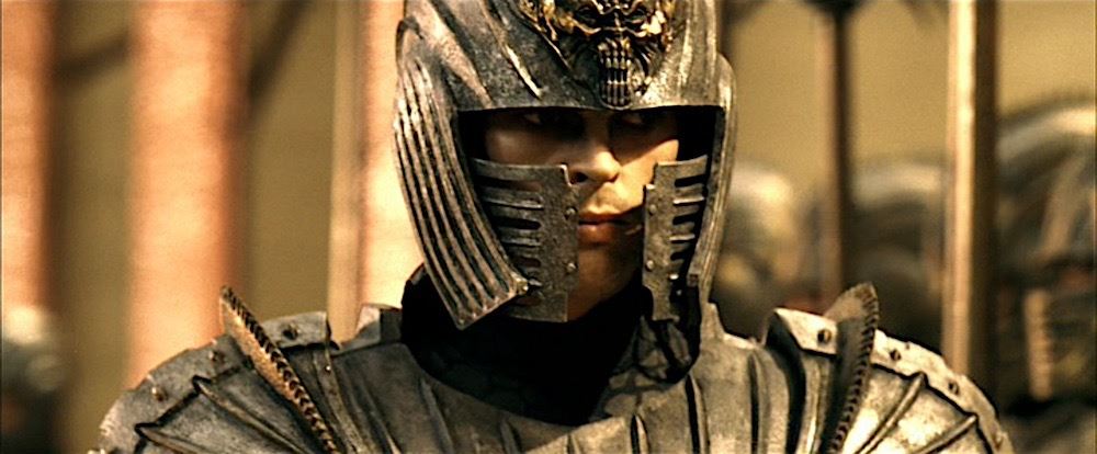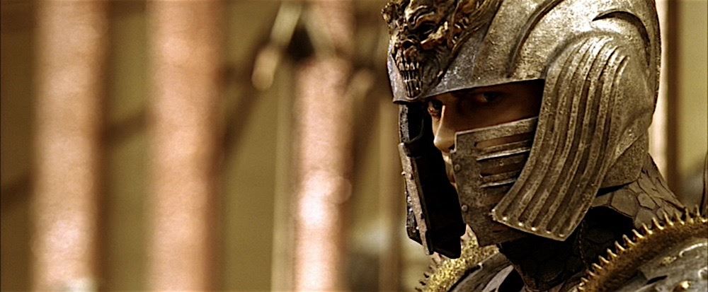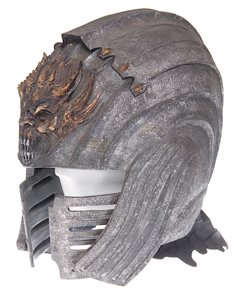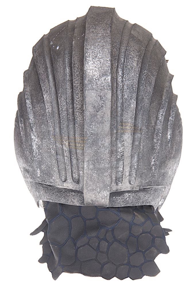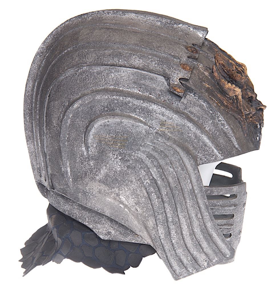 (Universal Pictures, 2004) This helmet was custom-made by the production for use by Karl Urban as "Vaako" during filming. The helmet is made of fiberglass and detailed to look like well worn metal. The helmet features and open (reveal) face guard and distressed gold colored creature face on the forehead. The helmet is an iconic artifact from the popular film. Measures 10.5" x 12" x 8.5".