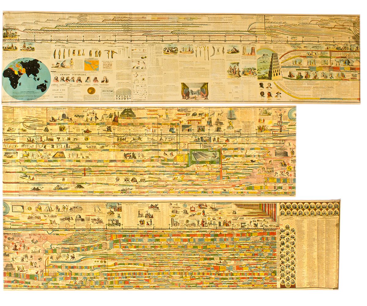c1875 Incredible color illustrated pictagraph timeline history of the world. Linen on cnavas backing, great color illustrations and diagrams, from the beginning of time through 1873-1874. It measures 28" wide, and a whopping 21 feet long. Done by the Strobridge & Co. lithographers of Cincinatti. It has a winding spool with handles at each end. Must be seen to be appreciated. - HKA#66337