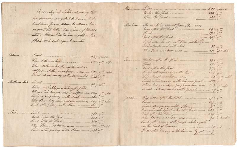 Autograph Document. Four pages, 6 1/4” x 7 7/8”. No place. No date. The document reads, in part: A cronological [sic] table, by John Watkins at the request of his Sister Dunkin showing the few persons competent to transmit by tradition from Adam to Moses, the account the latter has given of the creation, the Antedeluvian world, the flood and subsequent events ... These five persons were competent to hand down to Moses by tradition, the account he has given, of the creation, the history of the antedeluvian world, the account of the flood, and of the transactions subsequent thereto to his time ... The life of man being protracted in those ages to the great length we find them recorded, clearly proves the practibility of the correctness of Moses’ history, by tradition, if there were no written monuments of them, to assist him; a thing of which there is no evidence, but solely founded on presumption, which is stronger on the other side, as the Egyptians are said to have been in his day a learned people, and Moses himself know how to write.” The individuals listed are, Adam, Metheuselah, Noah, Shem, Abraham, Isaac, Jacob, Joseph, Levi, Kohath and Amram. Extremely Fine.