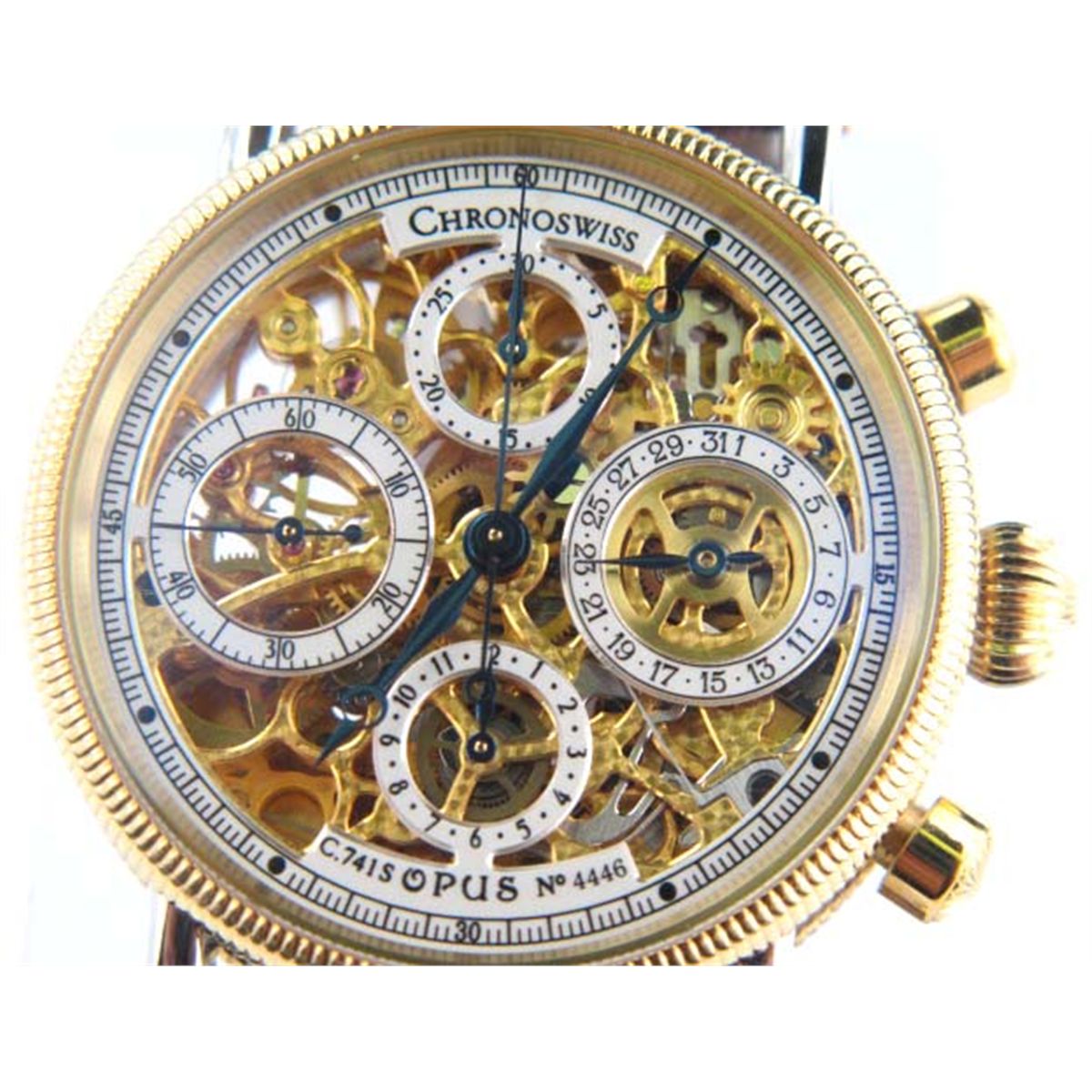 ?Chronoswiss Handmade Watch.The total weight of the watch is 80.3 grams.The head size is 38 mm in diameter. The thickness is 15 mm.The leather strap is 19 mm wide.The length of the watch is 9".Swiss Made.