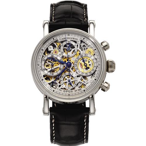 <B>Chronoswiss Men's Platinum Automatic Chronograph Opus Skeletonized Leather Strap Watch, 2000</B></I><BR><BR>Case: 38 mm circular, platinum with coin edge bezel front and back, platinum onion crown<BR>Dial: skeletonized with blued steel Breguet "Losange" hour, minute and second hands, analog date sub dial at 3 o' clock position, chrono center second along with 30-minute register and 12-hour register sub dials, individually numbered (No. 025) on the dial at the 6 o' clock position next to the name "Opus"<BR>Movement: Automatic Chronoswiss Caliber C.741, highly skeletonized with rhodium plated skeletonized rotor with the skeletonized Chronoswiss logo, chronograph, encapsulated by sapphire crystal front and back, permitting full view of the movement from all angles<BR>Bracelet: black Louisiana crocodile leather strap with platinum buckle<BR>Signed: triple signed Chronoswiss on the dial, skeletonized rotor and buckle<BR>Notes: Watch is No. 25 in a limited production of 50 watches made worldwide. Accompanied by a Chronoswiss mahagony finished, gray interior fitted Chronoswiss box, complete with magnifying lens, and certificate of authenticity, dated June 19th, 2000 <B>Condition Report:</B> Type:Men's Platinum Skeletonized Watch<BR><BR>Signed:Chronoswiss<BR><BR>Model:Opus Skeleton Chronograph<BR><BR>Model #CH 7520 S<BR><BR>Dial:Silvered Skeleton<BR><BR>Hands:Blued Steel Breguet Losange<BR><BR>Metal:Platinum<BR><BR>Gram Weight:115.30 Grams<BR><BR>Case #:915<BR><BR>Watch Movement:Automatic, Skeletonized with Rhodium Plated Skeletonized Rotor with Skeletonized Chronoswiss Logo, Chronoswiss Caliber C.741<BR><BR>Length:9 inches<BR><BR>Width:38 mm<BR><BR>Height:48 mm<BR><BR>Thickness:13 mm<BR><BR>Band:Black Louisiana Crocodile Strap with Silver Thread and Platinum Clasp<BR><BR>Circa:Modern<BR><BR>Condition: Very Good. Watch is in Working order<BR><BR>Stones:None<BR><BR><BR><b>Shipping:</b> Miscellaneous Collectibles, Smal (<a target="_blank" href="http://www.heritageauctions.com/common/shipping.php">view shipping information</a>)