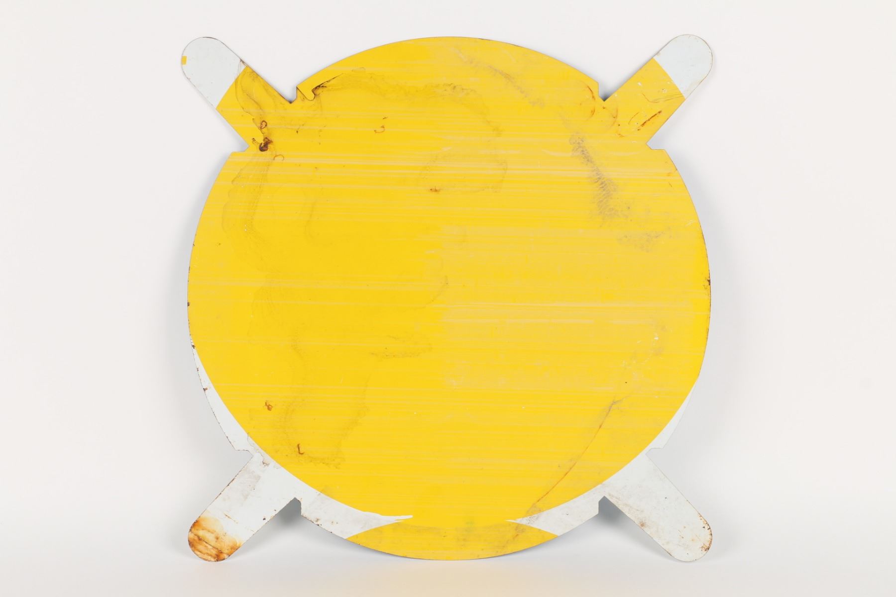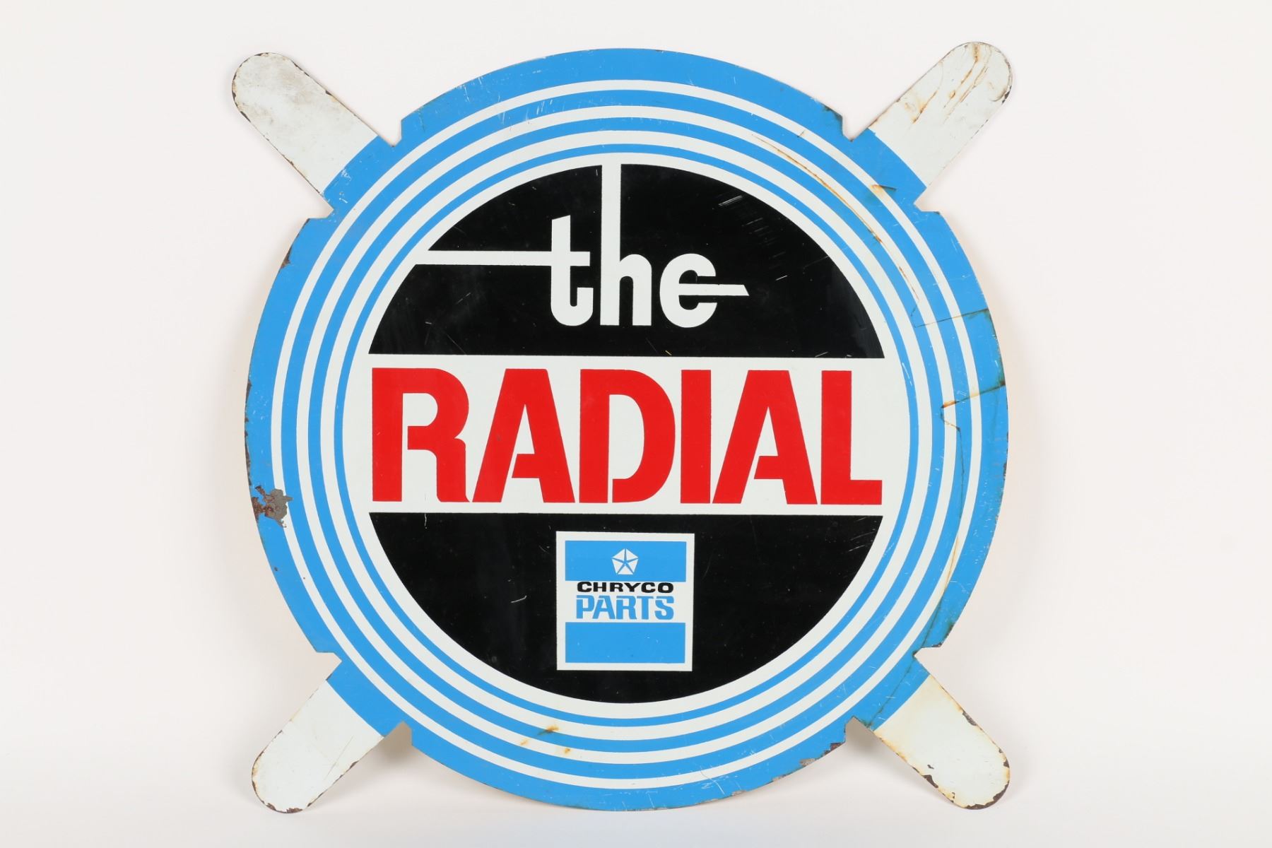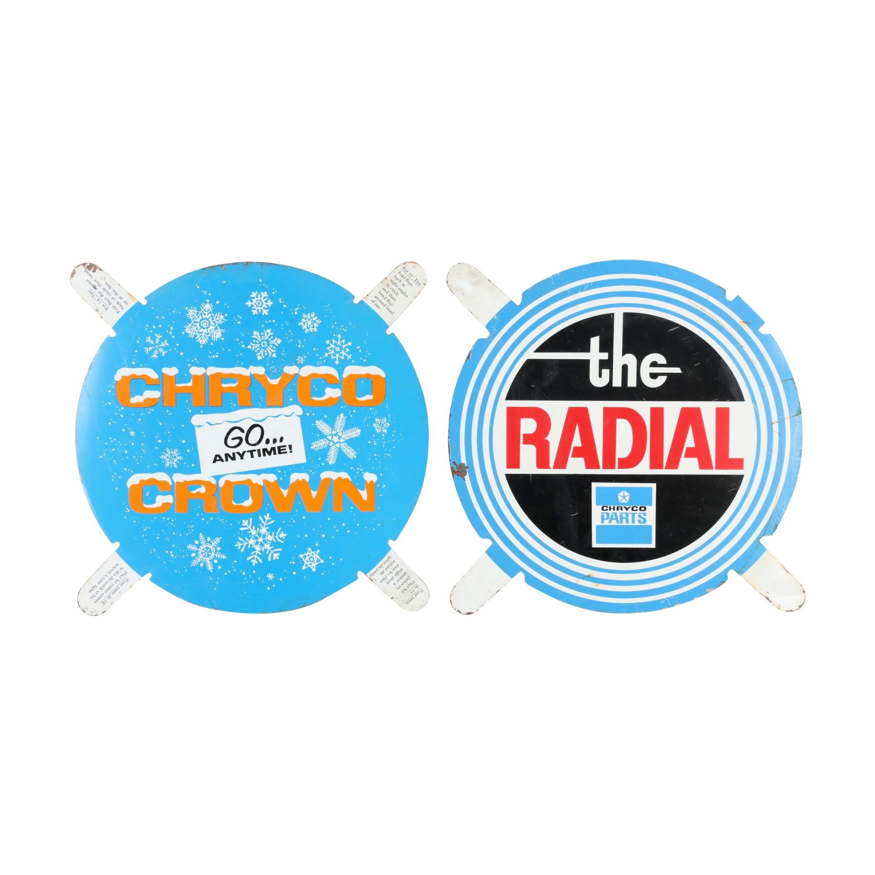 Two (2). Circa 1960s. Single-sided lithographed tin. Designed to fit within a new tire for promotional purposes. Minor edge and surface flaking. Oxidization. 16" x 16" with tabs. $150-250.