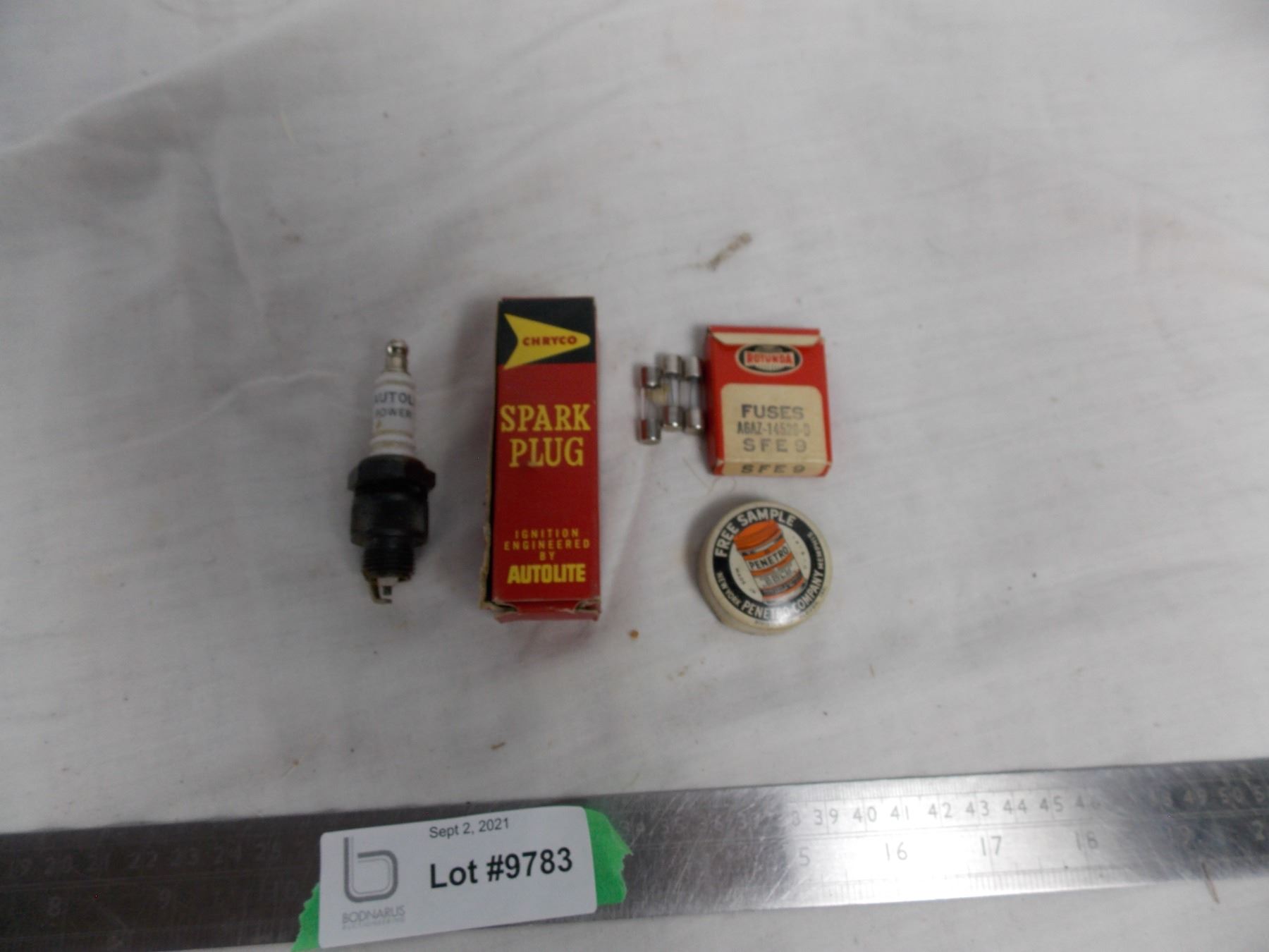 Chryco sparkplug, rotunda fuses, penetro sample tin