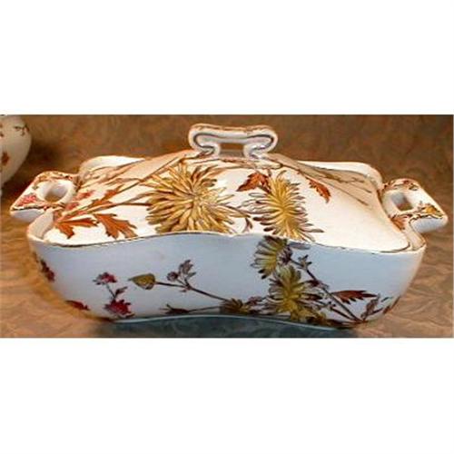 Aesthetic pottery and fine antiques. </td></tr><tr> <td> </td></tr><tr> <td>Reference #: 851gj</td></tr><tr><td>Condition:Very Good</td></tr><tr><td>Year:circa 1900</td></tr><tr><td>Country:England</td></tr><tr><td>Maker:George Jones & Sons</td></tr><tr><td>Height:4.25</td></tr><tr><td>Depth:5.75</td></tr><tr><td>Width:10</td></tr><tr><td>Title:Chrysanthemum George JONES Crescent Mark Veg.</td></tr><tr><td>Style:Chrysanthemum</td></tr><tr><td>Location:Buffalo, NY</td></tr></table>