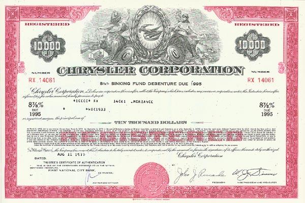 1977, Delaware. $10,000 Bond bearing 8 7/8 % interest. Pink/Black. Vignette of the Chrysler logo flanked by female allegorical figures and a city scene in the background. Punch cancelled and extremely fine.