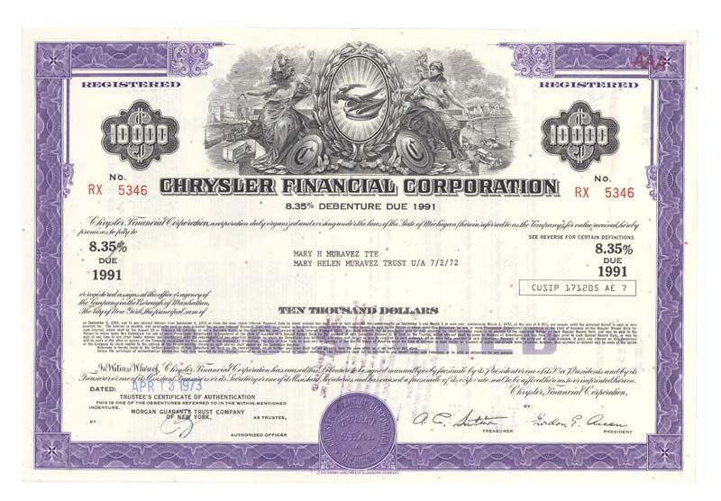 1973, Michigan. $10,000 bond bearing 8.35%. Purble/Black. Top center vignette with allegorical figures flanking Chrysler emblem, images of classic autos in traffic create the backdrop. Punch cancelled.