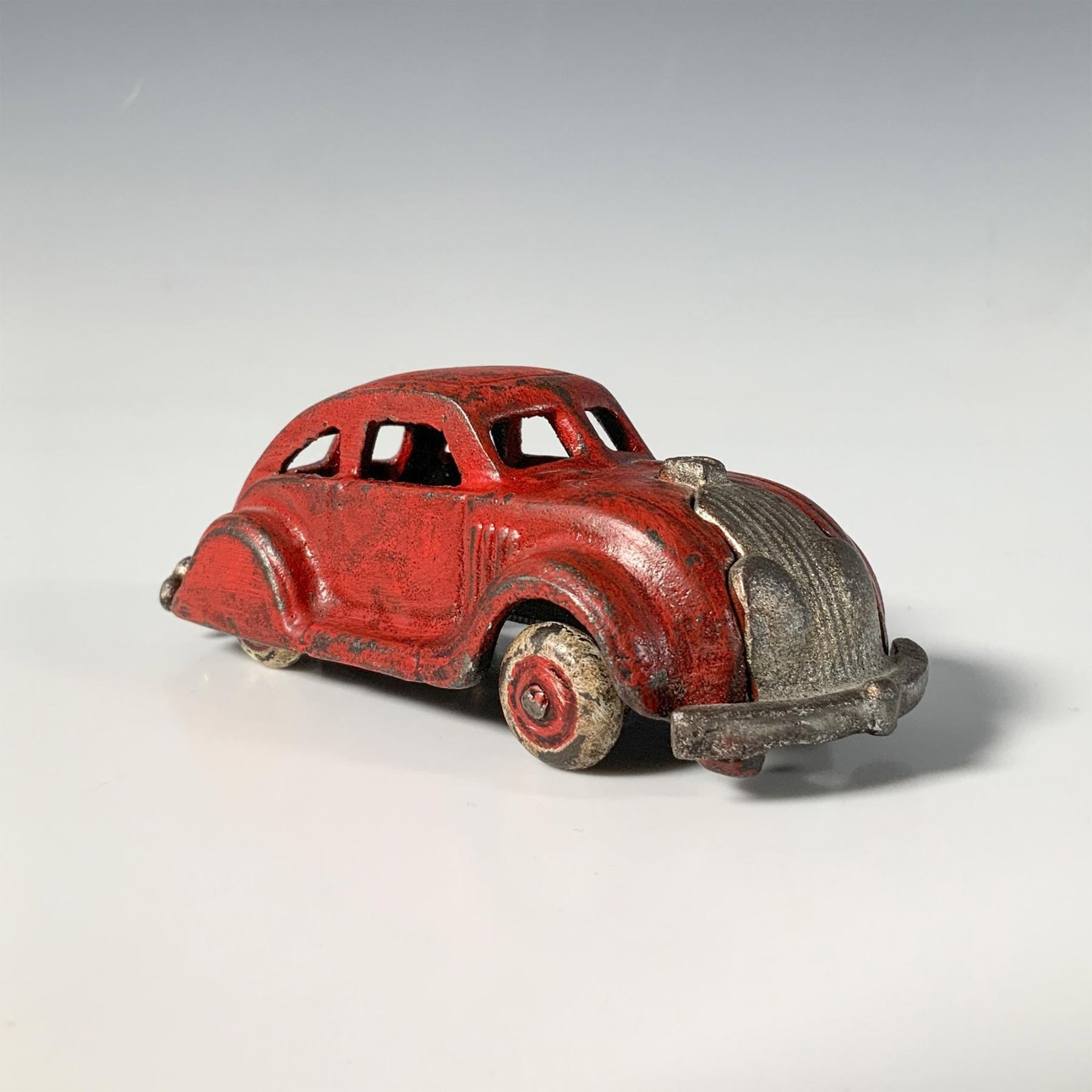 A vintage toy car modeled after the iconic 1930s Chrysler Airflow, featuring a vibrant red hue with detailed molded lines and accents.