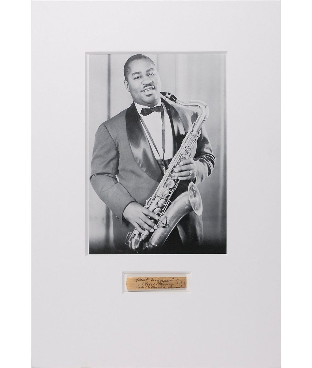 Influential swing tenor saxophonist (1908–1941). Vintage C. G. Conn Ltd. Special saxophone reed, signed in fountain pen, “‘Best Wishes,’ Chu Berry, Cab Calloway Band.” Attractively mounted and matted with a photo of Berry to an overall size of 13.5 x 19.75. In fine condition.