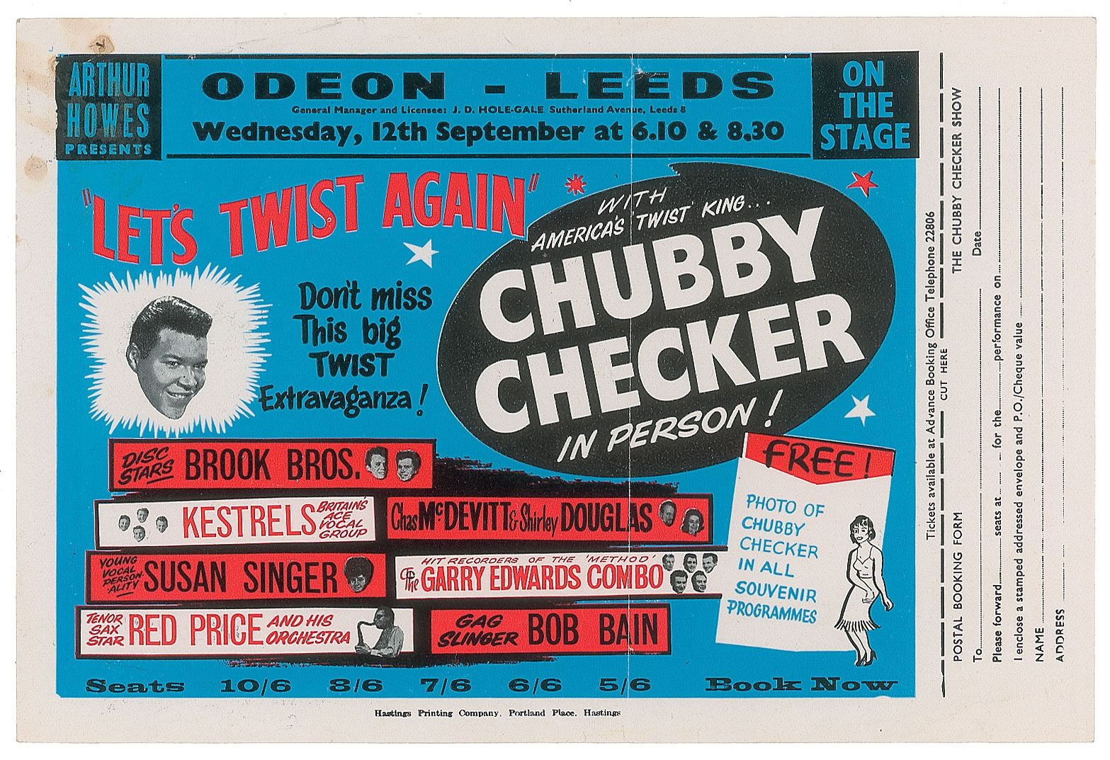 Original color 10 x 6.75 handbill for a Chubby Checker concert presented by Arthur Howes at the Odeon Theatre in Leeds, England, on September 12, 1962, with bold text reading: "'Let's Twist Again,' Don't miss this big twist extravaganza! With America's Twist King…Chubby Checker In Person!" The other acts listed on the handbill include: The Brook Brothers, The Kestrels, Susan Singer, Red Price and His Orchestra, Charles McDevitt and Shirley Douglas, The Garry Edwards Combo, and Bob Bain. In very good to fine condition, with scattered light creasing, a vertical fold, and staining to the upper left corner.