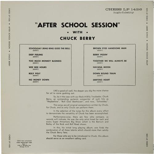 <B>Chuck Berry "After School Session" LP Chess 1426 (1957).</B></I> The Rock and Roll Hall of Famer's first LP went largely unnoticed in the day when the 45 single was king, which makes this gem a true collector's dream. Berry wrote all 12 tunes featured here, including the classics "School Day (Ring Ring Goes the Bell)", "Too Much Monkey Business", and "Brown Eyed Handsome Man". We've never seen a nicer copy. Condition: NM 8/ NM 8. <I>From the GRT Collection</B></I>.