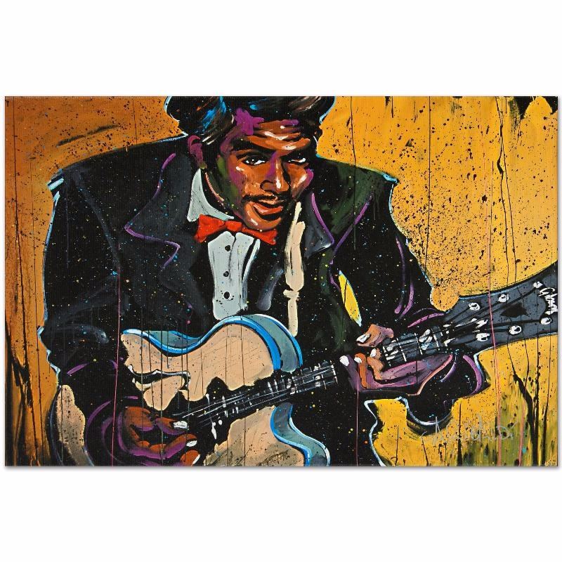 Combining his passions for music and art, David Garibaldi creates stunning visual poetry. "Chuck Berry (Chuck)" is a limited edition giclee on stretched canvas, AP numbered and bearing the artist's authorized signature. This piece is gallery wrapped and ready to hang. Includes Certificate of Authenticity! Measures approx. 40" x 30" (image). Retail Price $800.00. PRICE INCUDES FREE SHIPPING IN THE U.S. - SHIPPING WILL BE ADDED TO YOUR INVOICE FOR ALL BUYERS OUTSIDE OF THE U.S.