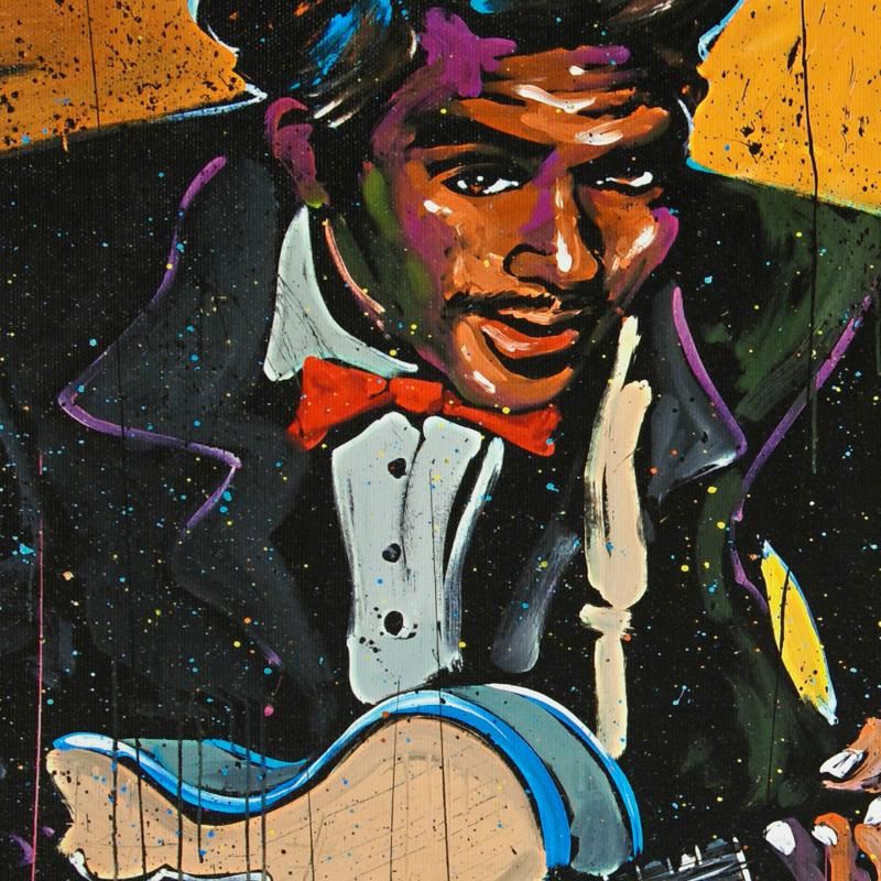 Combining his passions for music and art, David Garibaldi creates stunning visual poetry. "Chuck Berry (Chuck)" is a limited edition giclee on stretched canvas, numbered and bearing the artist's authorized signature. This piece is gallery wrapped and ready to hang. Includes Certificate of Authenticity! Measures approx. 48" x 60" (image).