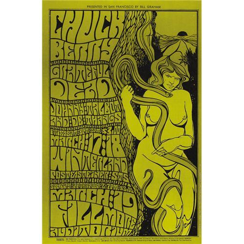 <B>Chuck Berry/Grateful Dead Fillmore Concert Poster BG-55 (Bill Graham Presents, 1967).</B></I> The rockin' '50s meets the stone groove of the late '60s with this generation-spanning concert, featuring Mr. Johnny B. Goode himself, Chuck Berry, plus the trippy sounds of Jerry Garcia's Grateful Dead -- what a show! Artist Wes Wilson provided the Art Nouveau inspired "nude with snake" design. This is a first printing; there's a few staple holes and corner creases, but it remains an attractive Very Good condition poster.