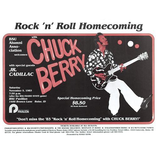 <B>Chuck Berry "Rock 'n' Roll Homecoming" Concert Poster (1983)</B></I> It's time for the annual Homecoming event at Boise State University! Who better to call on than Rock's elder statesman, Chuck Berry? And he won't be duck-walking across the stage alone -- he's bringing along retro-rockers Jr. Cadillac! Even if you've never set foot in Idaho, you'll dig this nostalgic 24.75" x 18.5" red and black poster. It's in excellent NM condition, so place that winning bid and have Happy Days again!