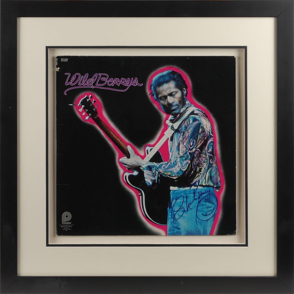 Wild Berrys album signed on the front cover in blue felt tip, “Chuck Berry,” adding a smiley face. Mounted, double-matted, and framed to an overall size of 20 x 20. In fine condition. The record is included.