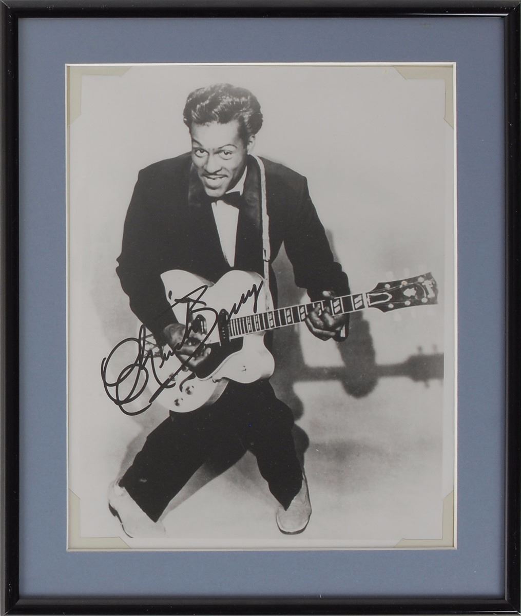 Glossy 8 x 10 photo of Berry crouched and playing his Gibson in a suit and bow-tie, signed in black felt tip. Matted, framed, and in fine condition.