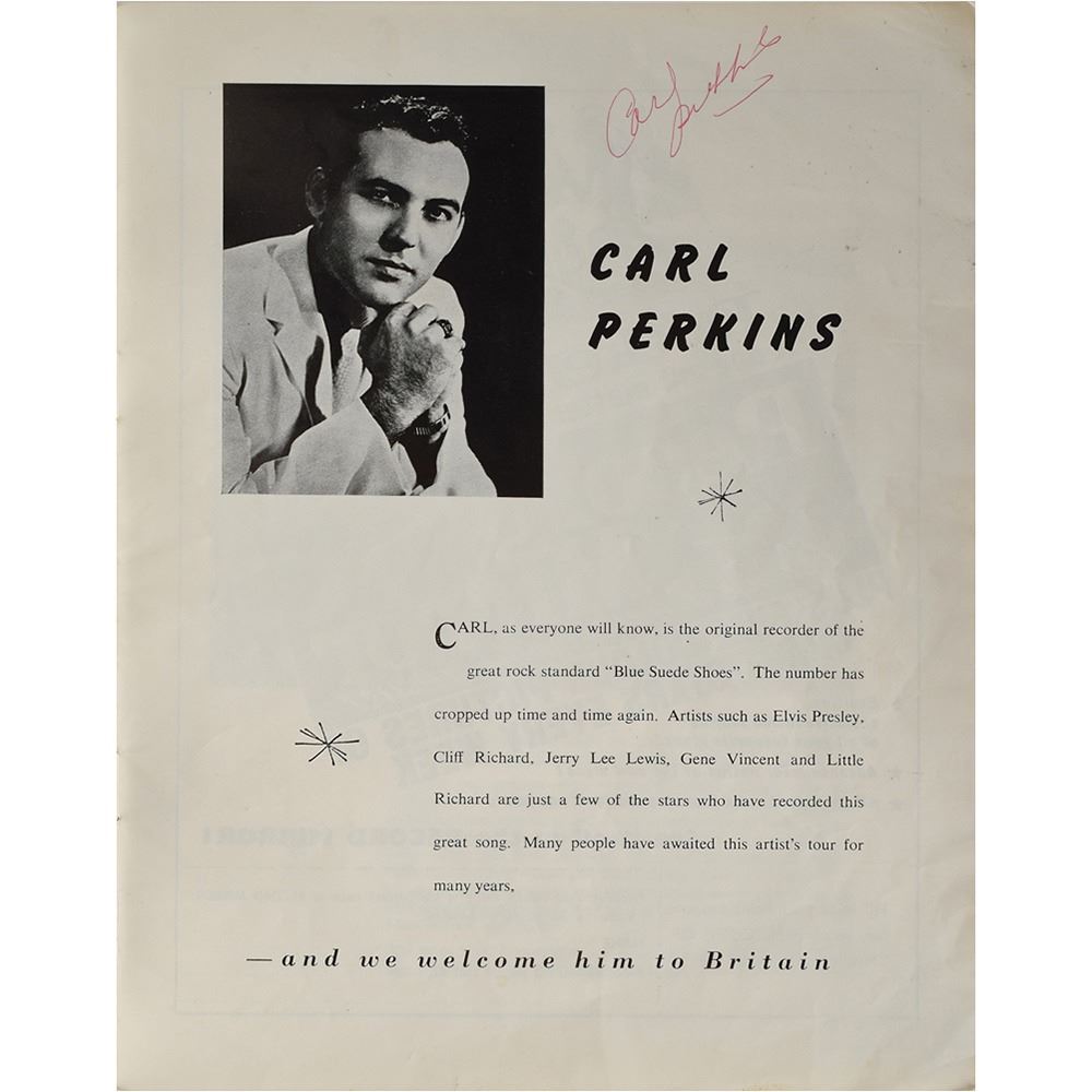 Circa 1964 vintage program for a concert showcase headlined by Chuck Berry, measures 8 x 10.5, signed and inscribed on the inside of the front cover in black ballpoint, "Best wishes to Carolyn, Chuck Berry," and on his respective artist page in red ballpoint, "Carl Perkins." In very good condition, with moderate overall creasing and handling wear. Accompanied by a certificate of authenticity from Tracks.