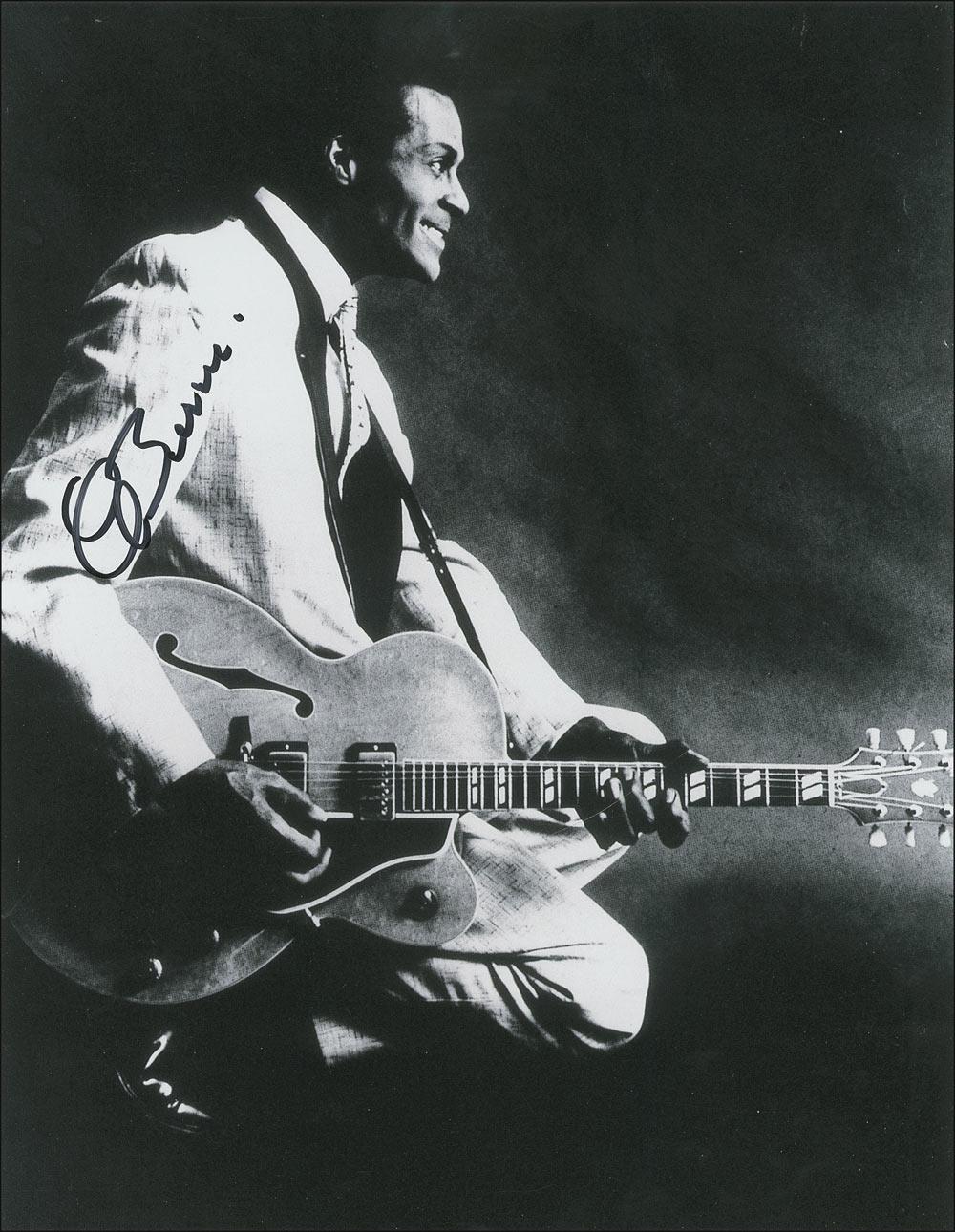 Glossy 11 x 14 photo of a young Berry doing his famous ‘duck walk,’ signed in black felt tip. In very fine condition.