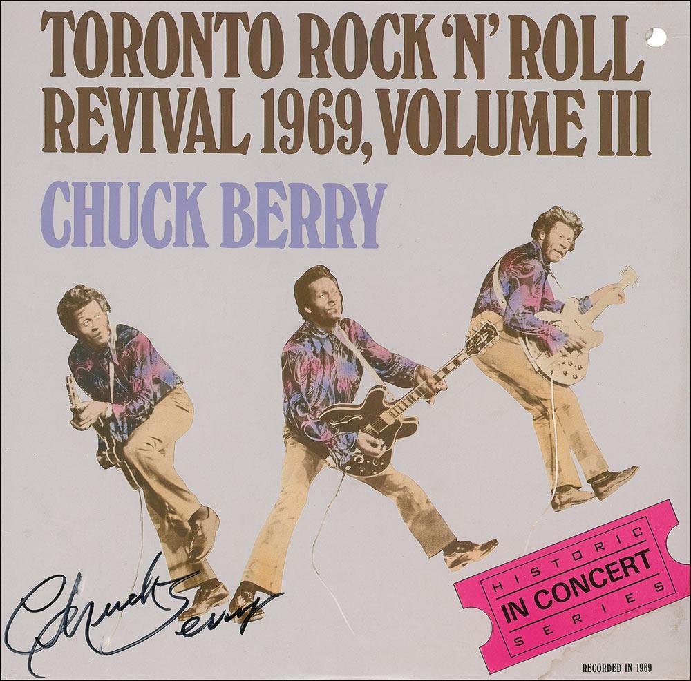 Toronto Rock ‘N’ Roll Revival 1969, Volume III album signed on the front in black felt tip. In fine condition, with small area of dampstaining to lower right and a punch hole to top right corner. The record is included.