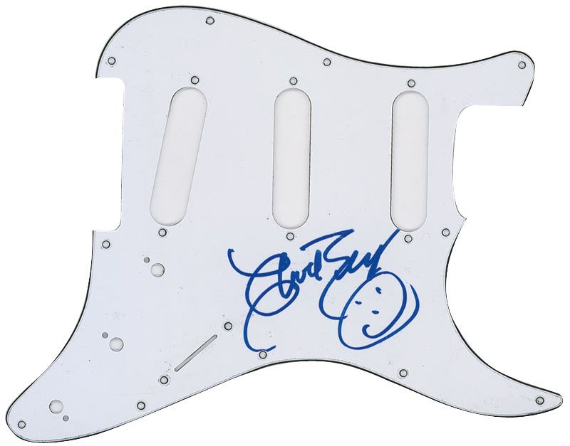 White pickguard for a standard-size stratocaster, signed in blue felt tip, “Chuck Berry,” adding a smiley face. In fine condition, with scattered light rubbing and small surface marks.